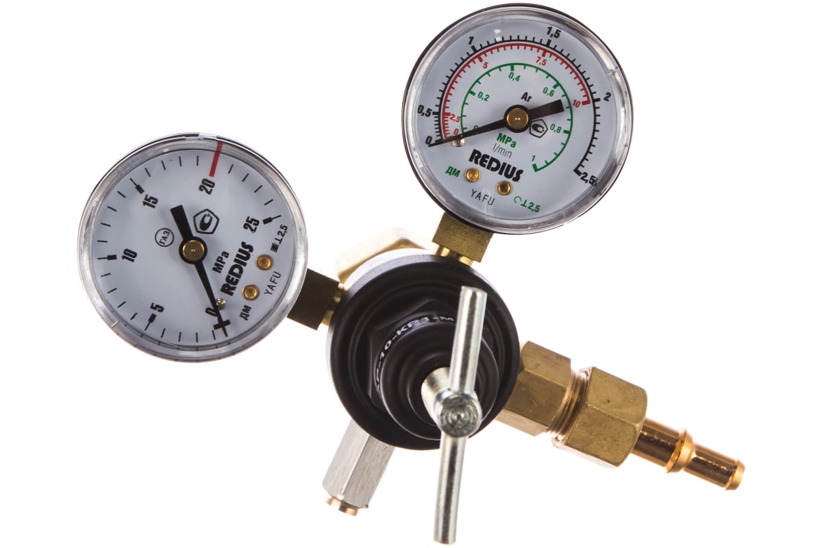Регулятор аргоновый REDIUS АР-10-КР1-м СВ000009576 оснащен манометрами высокого и низкого давления (позволяет контролировать расход рабочего газа). Конструкция устройства основана на осевой схеме, что позволило значительно уменьшить размеры при сохранении всех рабочих параметров (на уровне крупногабаритных газовых редукторов). Регулятор изготовлен из высокопрочного пластика, не подвержен вредным воздействиям грязи, влаги, а также, непосредственно, аргона.
