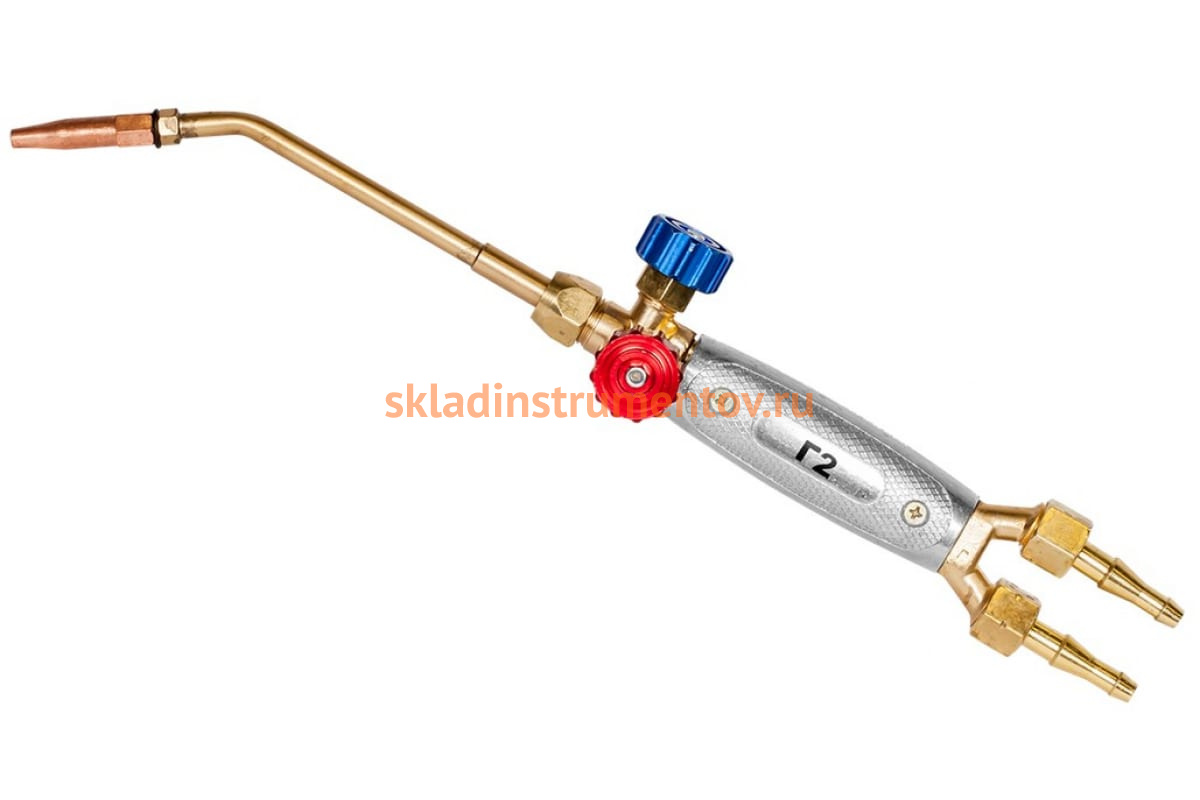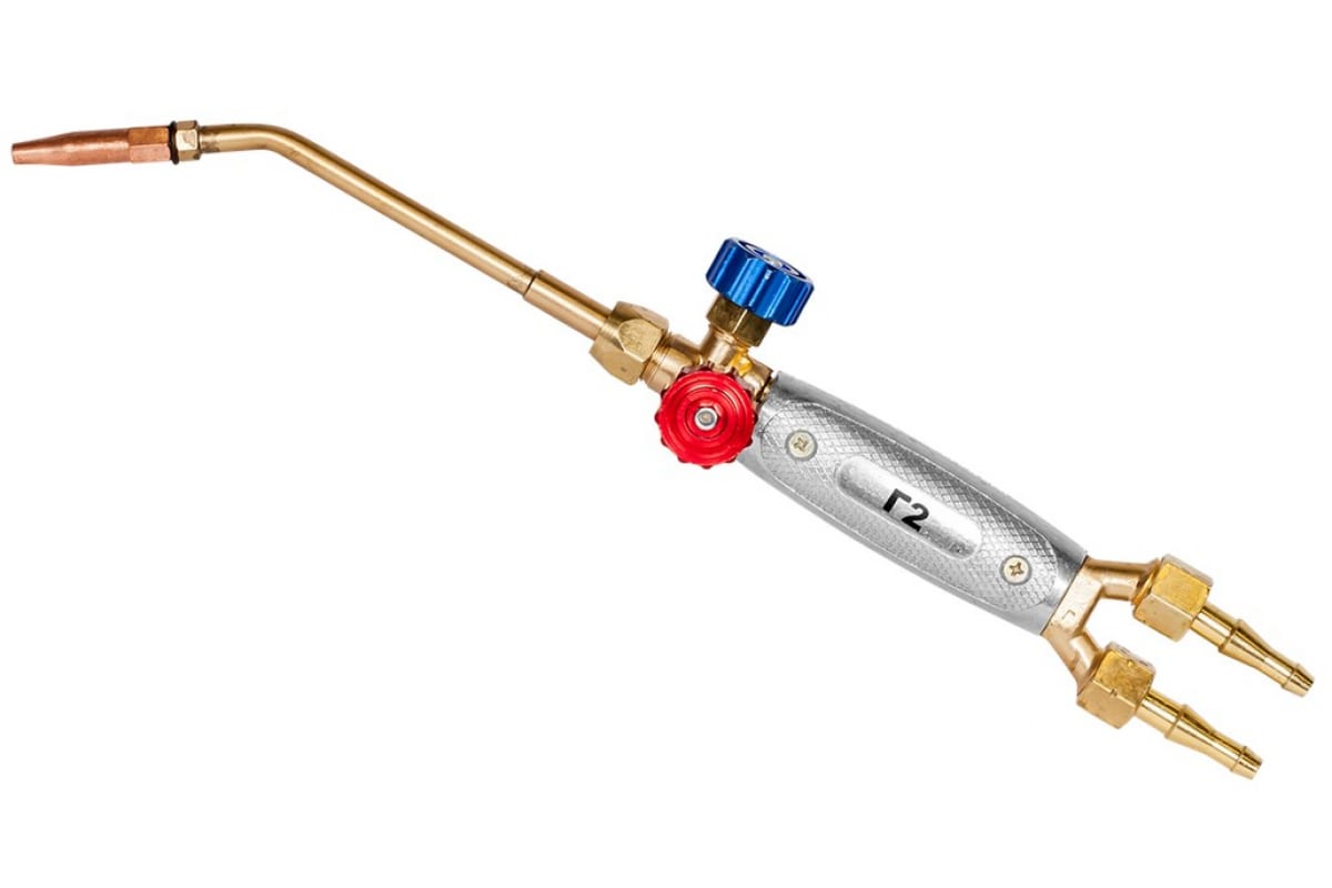 Ацетиленовая горелка Сварог Г2-23 00000093394 применяется для сваривания металла толщиной от 1 до 4 мм. К стволу по резиновым рукавам подается кислород и ацетилен. Смешивание газов - инжекторное. Мощность пламени регулируется вентилями и сменой наконечников.