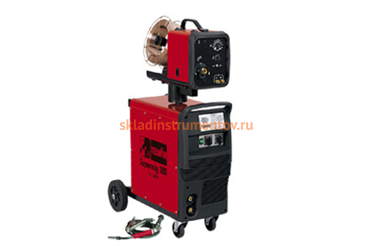 Сварочный полуавтомат TELWIN SUPERMIG 380 предназначен для сварки стали, нержавеющей стали и алюминия. Аппарат работает как от сети, напряжением 230 В, так и 400 В. На корпусе аппарата расположены вентиляционные отверстия, которые способствуют быстрому забору воздуха необходимого для охлаждения. Простота транспортировки достигается за счет больших колес. Силу тока можно регулировать в диапазоне от 40 до 350 А. Данная модель работает как с инертными видами газов, так и с активными.