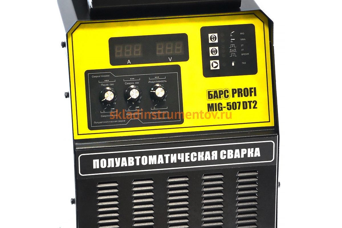 Сварочный полуавтомат БАРС Profi MIG-507 DT2 аттест. НАКС СВ000016979 работает двумя методами: MIG/MAG и MMA (электрододержатель приобретается отдельно). Для длинного и короткого шва предусмотрены режимы точечной сварки 2Т и 4Т. Аппарат работает в широком диапазоне свариваемых материалов: магний, титан, алюминий, никель и др.