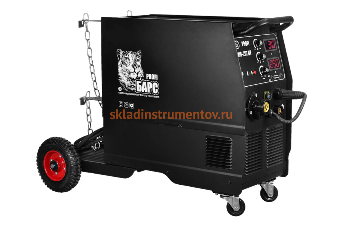 Сварочный полуавтомат Барс Profi MIG-257 DT 380 В СВ000006603 - мощный профессиональный аппарат инверторного типа, предназначенный для неразъемного соединения различных типов сталей и прочих металлов в полуавтоматическом (MIG/MAG) и ручном (MMA) режимах. Наличие тележки облегчает транспортировку данной модели к месту проведения работ. Малое разбрызгивание металла при сварке, минимальная пористость шва, стабильная сварочная дуга и существенная глубина проплавления гарантируют высокое качество работы. Продуманный дизайн аппарата способствует его комфортной эксплуатации.