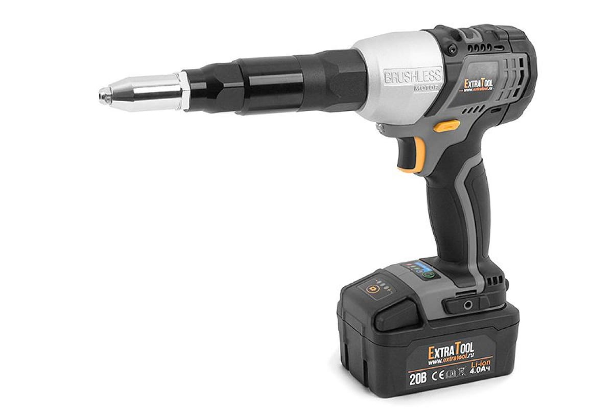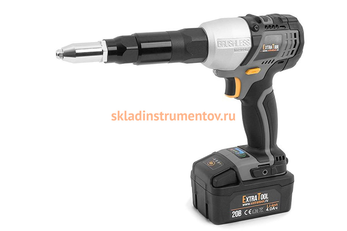 Аккумуляторный заклепочник EXTRATOOL RV-20102 работает с вытяжными заклепками размером 2.4-4.8 мм. Он функционирует в трех режимах: Н (высокие обороты) - 3000об\мин, L (пониженные обороты) - 1900об\мин и автореверс. Предусмотрена мощная диодная подсветка, что позволяет работать при плохом освещении или в темное время суток. Аккумуляторы имеют трехуровневую индикацию заряда, что помогает контролировать их состояние.