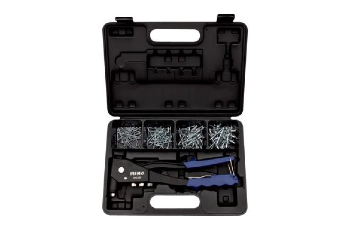 Набор с ручным заклепочником IRIMO 546-265-4 служит для скрепления листовых заготовок из стали, нержавеющей стали, меди. В комплект входит 4 сменные головки, которые позволяют работать с заклепками разного размера. Заклепочник изготовлен из прочного материала. Комплект поставляется в удобном и вместительном кейсе с ручкой и защелками.