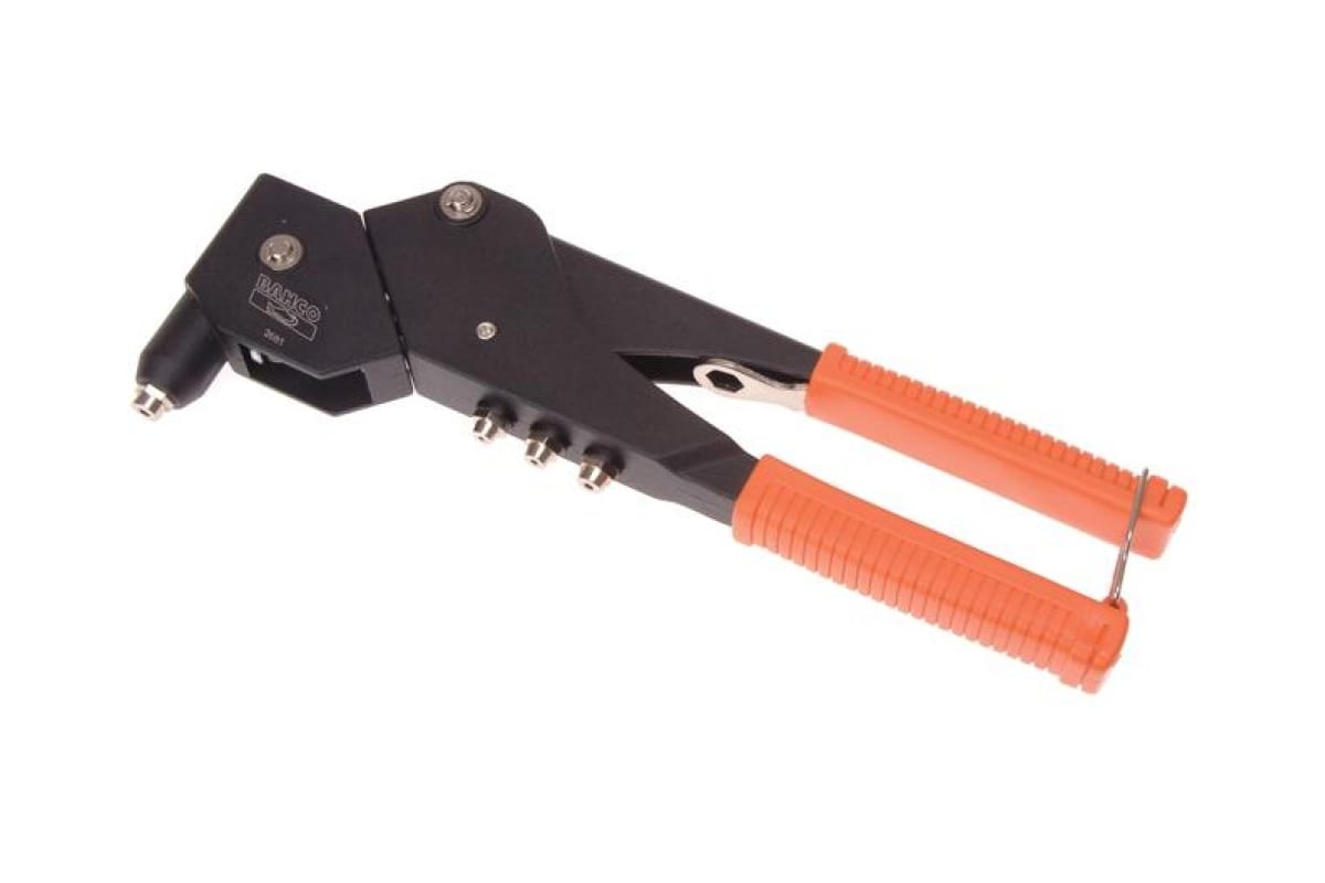 Клепальный молоток Bahco 2681 применяется для соединения разнообразных материалов между собой при помощи клепок 2.4, 3.2, 4.0 или 4.8 мм. Заклепочник подходит для работы с кожей, листовым металлом, винилом, тканью и пр. Для более удобного обхвата на ручках предусмотрены рифленые чехлы. Поворачивающаяся головка регулируется на 360 градусов, что обеспечивает легкость проведения работ в труднодоступных местах.