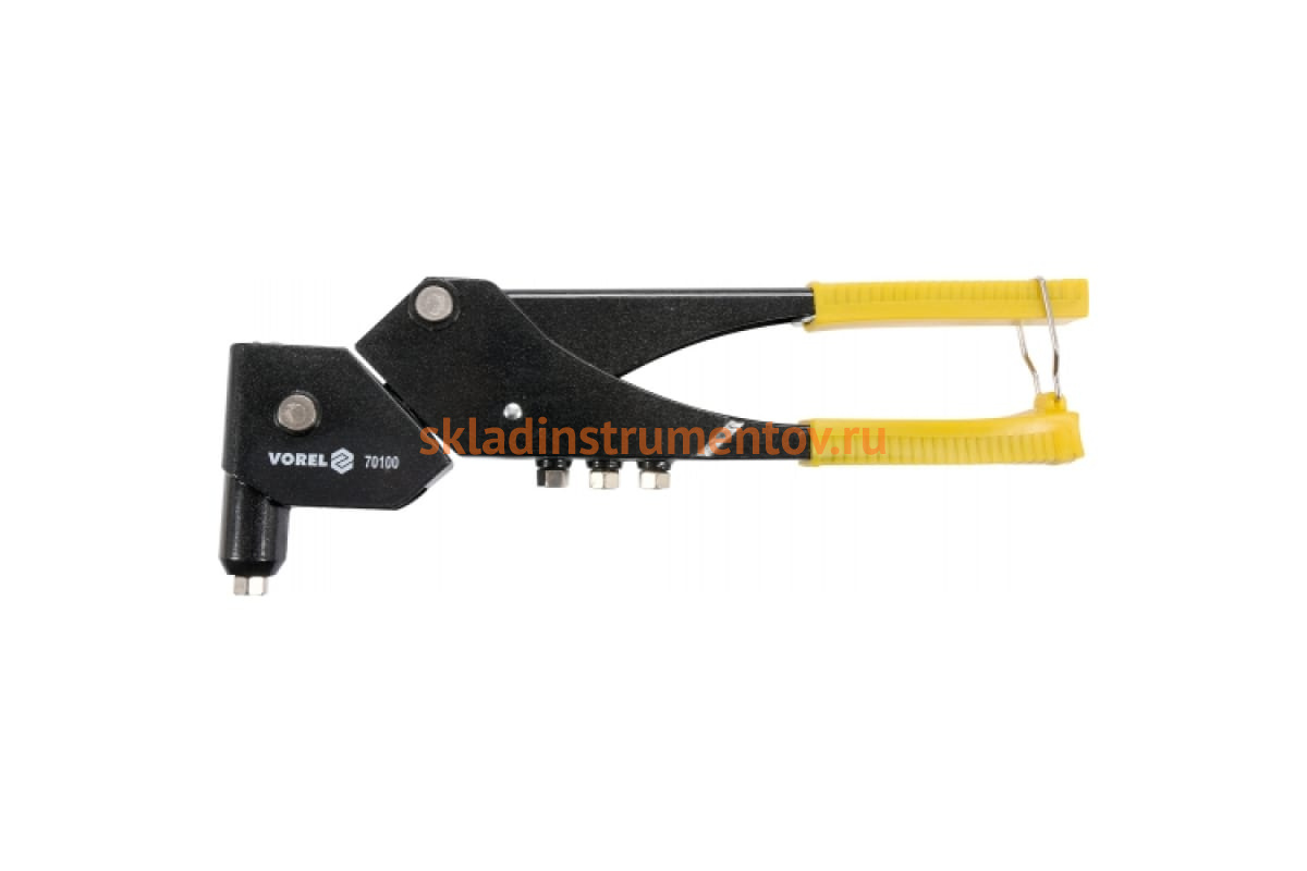 Алюминиевый заклёпочник VOREL поворотный 0-360º 70100 можно вращать вокруг своей оси, что допускает работу в труднодоступных местах. Усилия вращения достаточно для вытягивания заклепок до 4.8 мм в диаметре.