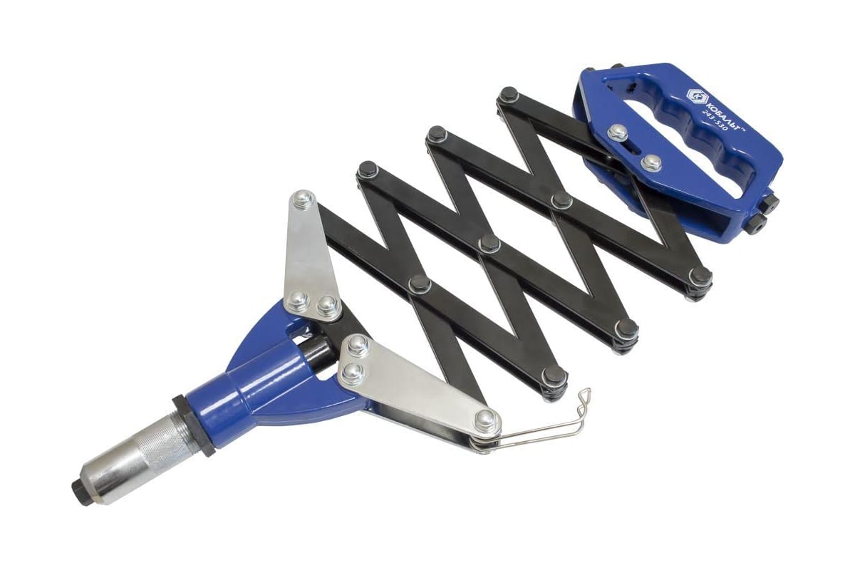 Рычажно-складной заклепочник КОБАЛЬТ 810 мм 243-530 - это прочный инструмент, который предназначен для скрепления друг с другом листов железа. Литая алюминиевая конструкция имеет рычажно-складную форму и оснащена прорезиненными рукоятками. В комплекте идет пять сменных головок.