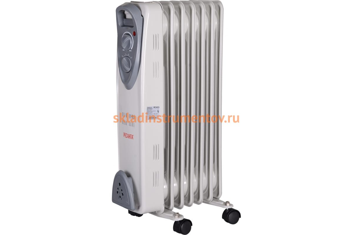Масляный радиатор Ресанта ОМ-7Н - прибор бытового назначения, который служит для обогрева помещений. Радиатор имеет три режима нагрева, которые переключаются при помощи удобной ручки. Прибор состоит из семи секций, имеет мощность 1.5 кВт и работает от электросети с напряжением 220 В. Четыре пластмассовых колеса крепятся на основании прибора - что позволяет с легкостью перемещать прибор в пределах помещения.