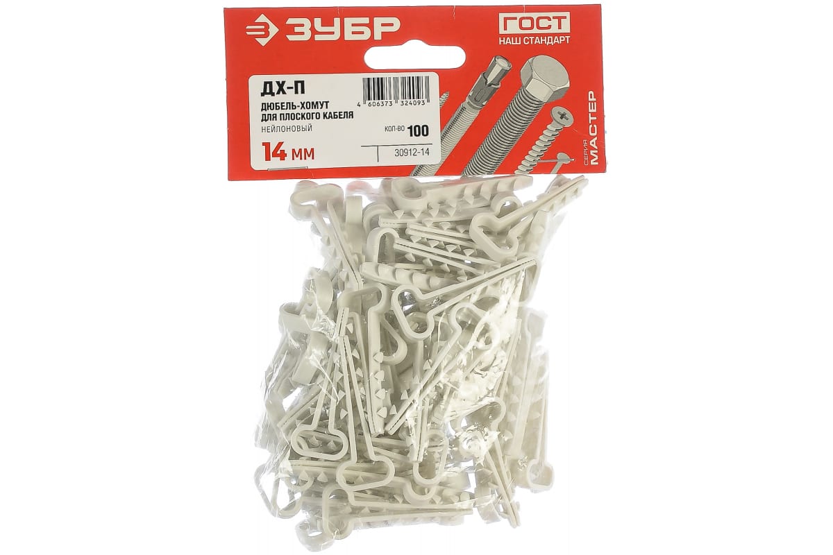 Дюбель-хомут для плоского кабеля Зубр ДХ-П, 14 мм, 100 шт, нейлоновый 30912-14 служит для быстрого крепления кабелей, проводов, труб ПВХ, гофрорукавов к полнотелым основаниям (бетон, кирпич, природный камень).