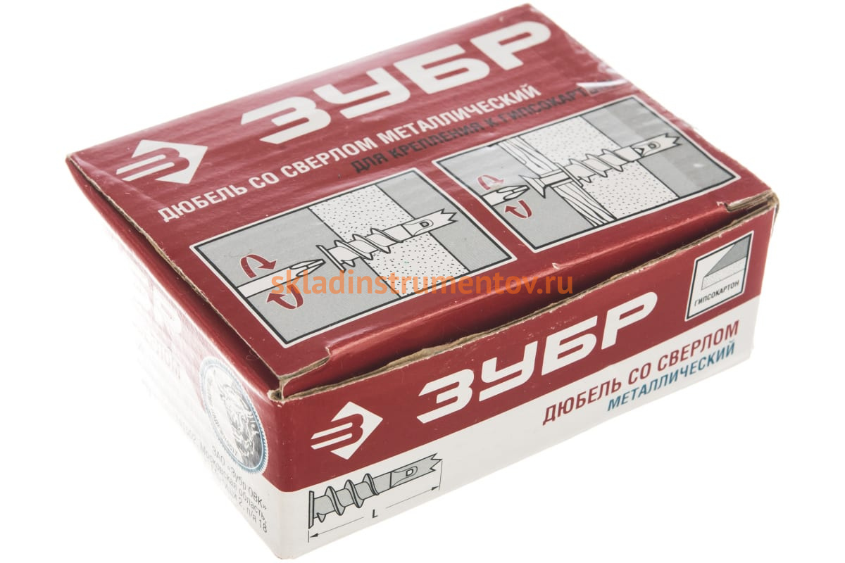 Металлический дюбель ЗУБР 4-301285 типа "Driva" используется при креплении к гипсокартону, например, светильников, плинтусов, выключателей. Фиксация осуществляется с помощью обычного шурупа диаметром 4,5 мм. Шуруп приобретается отдельно.