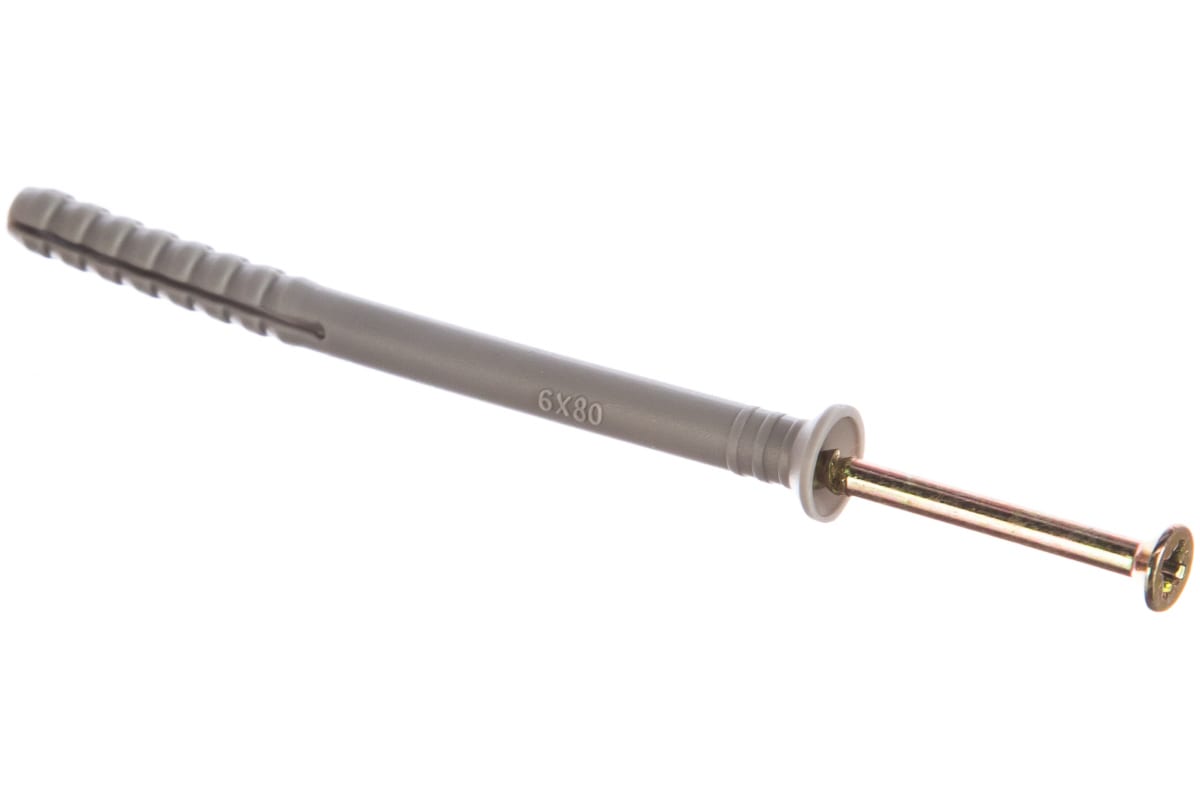 Дюбель-гвоздь СИБРТЕХ 6х80мм 100шт 42130 - это крепежное соединение, которое монтируется в кирпич, бетон или полнотелые материалы. Изделие состоит из полипропиленового дюбеля с потайным бортиком и стального гвоздя. Монтаж в поверхность осуществляется при помощи молотка.