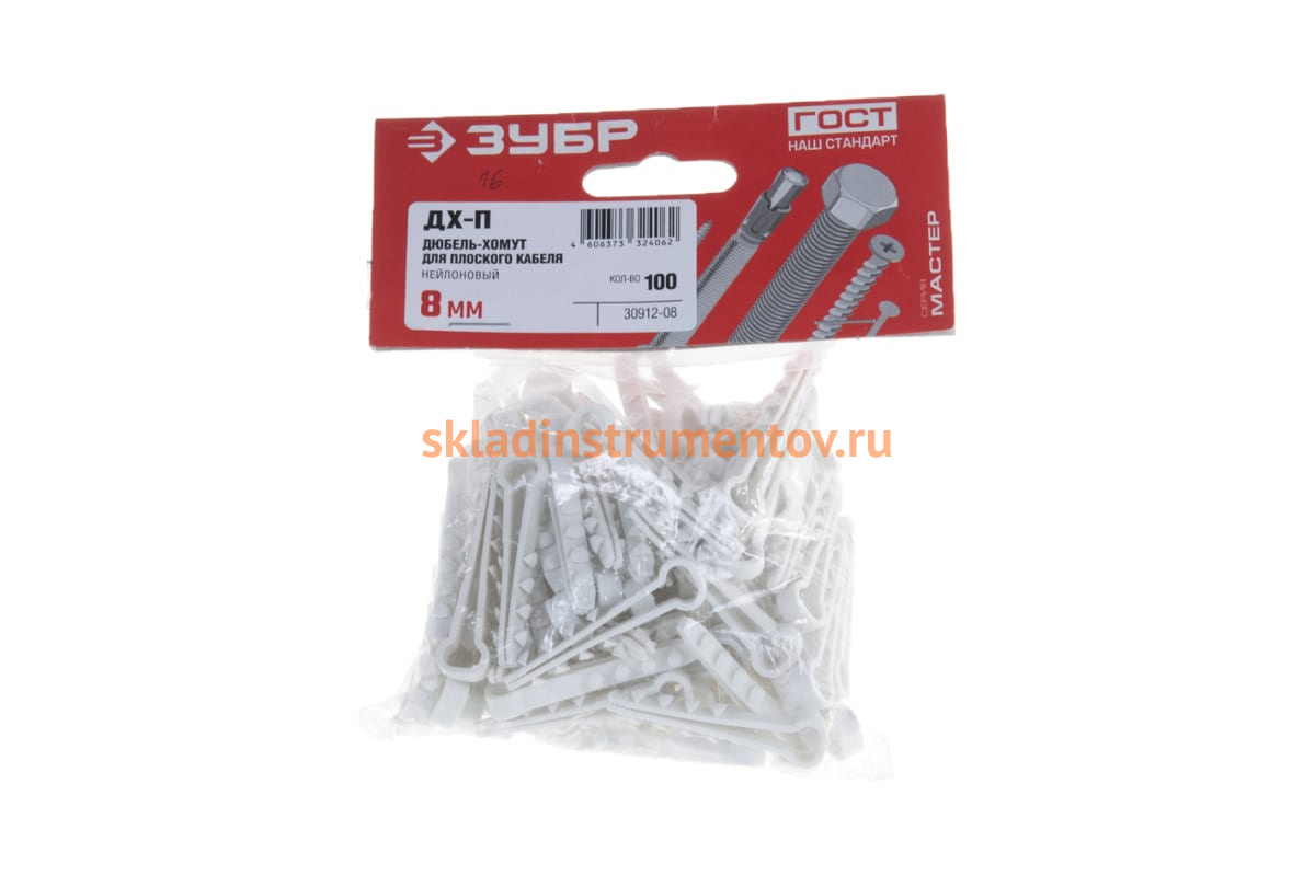 Дюбель-хомут для плоского кабеля Зубр ДХ-П, 8 мм, 100 шт, нейлоновый 30912-08 служит для быстрого крепления кабелей, проводов, труб ПВХ, гофрорукавов к полнотелым основаниям (бетон, кирпич, природный камень).
