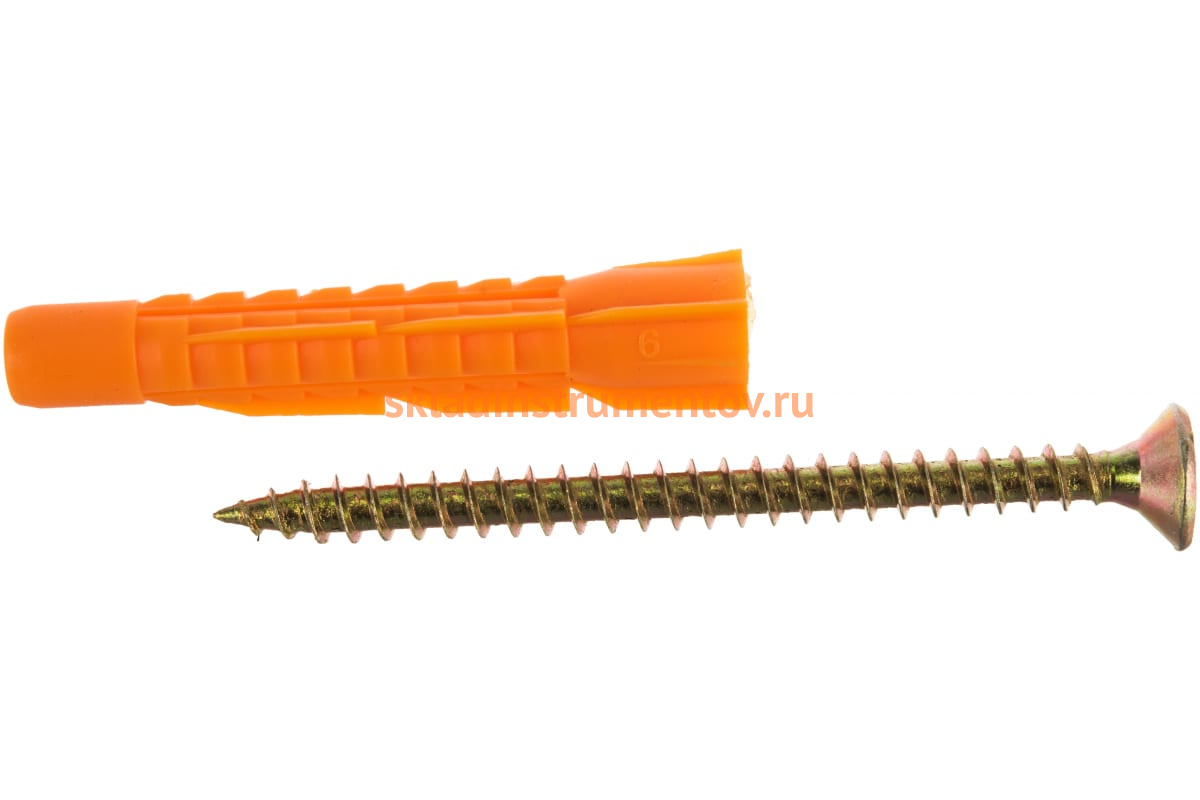 Универсальный дюбель Зубр 4-301196-10-061 применяется для закрепления неответственных конструкций как в плотных строительных материалах, так и в пустотелых. Без бортика. Прокручиванию дюбеля при монтаже препятствуют расположенные на конце блокировочные ребра. Три распорные зоны, раскрываясь, плотно и надежно фиксируют дюбель в отверстии. В комплект входит шуруп с потайной головкой (шлиц Pz). Шуруп изготовлен из оцинкованной стали, что исключает коррозию.