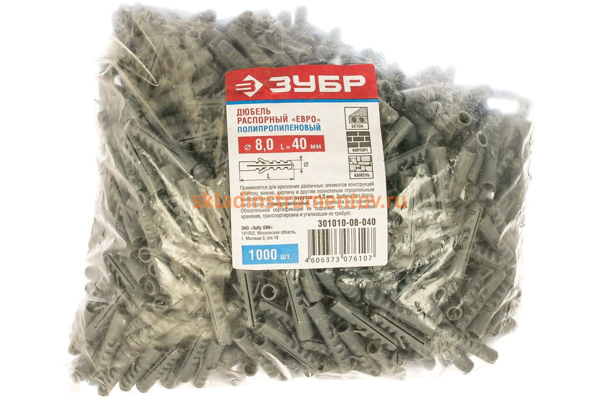 —Распорный дюбель Зубр ЕВРО, полипропиленовый, 8x40мм, 1000шт 301010-08-040—