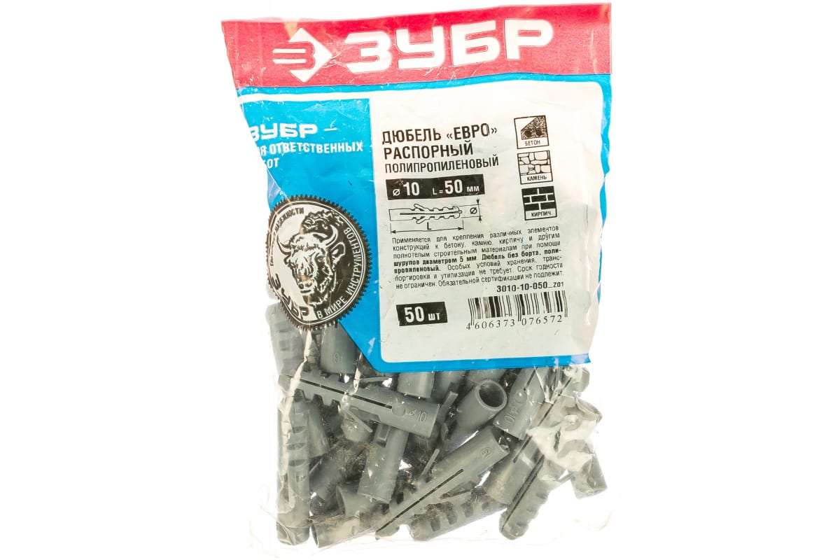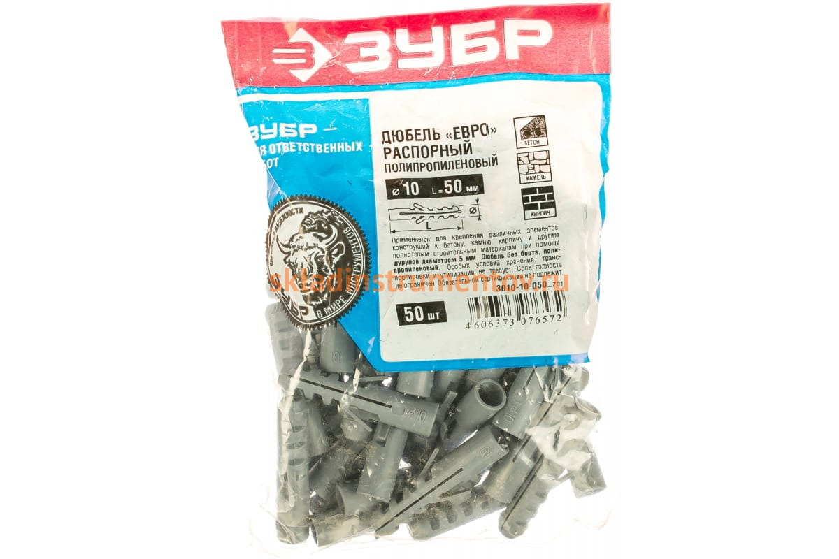 Полипропиленовый дюбель Зубр Евро 3010-10-050_z01 применяется для закрепления легковесных конструкций в плотных материалах (бетон, строительный камень, полнотелый кирпич). Без борта. Прокручиванию дюбеля при монтаже препятствуют стопорные усы, расположенные на гильзе.