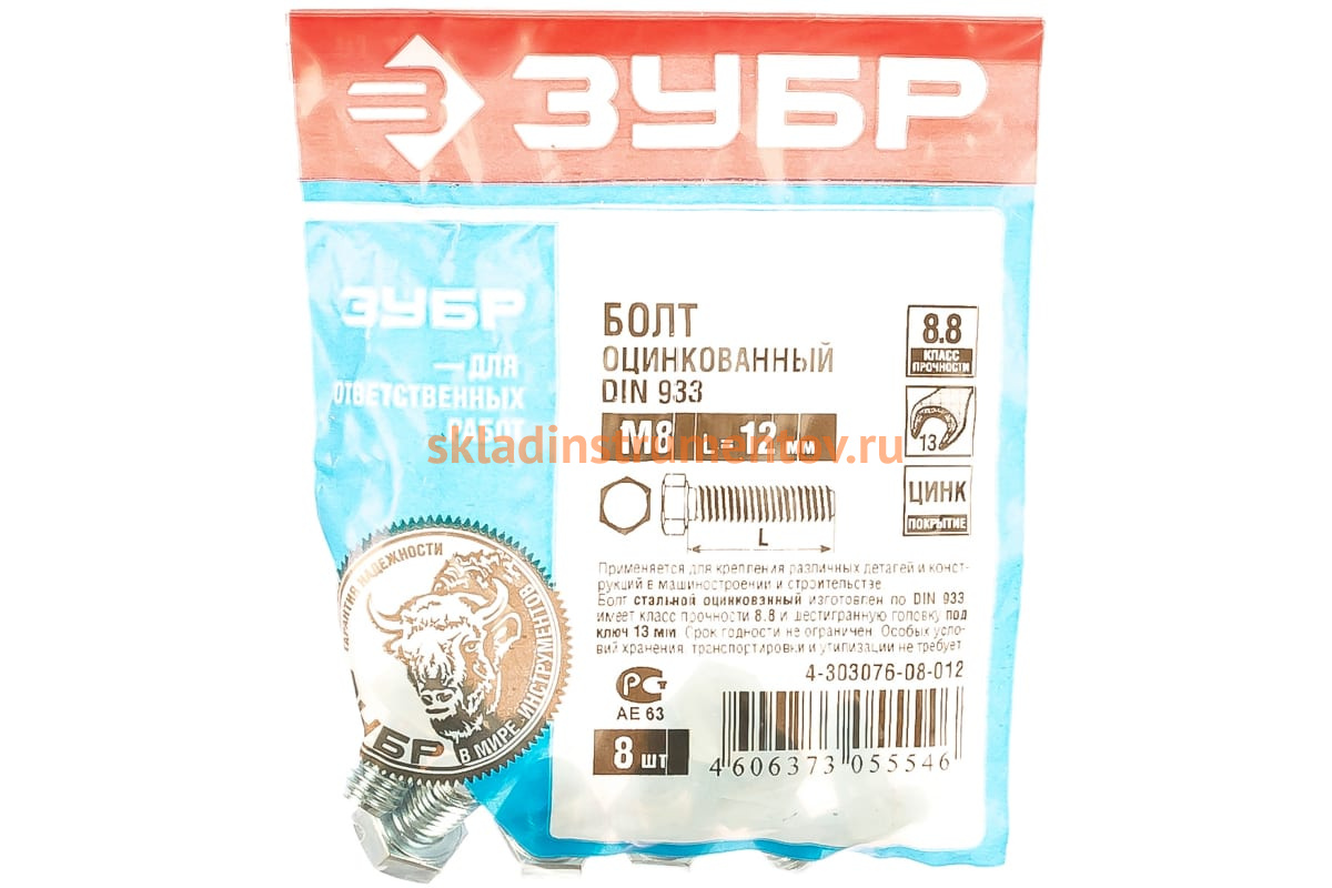 —Болт с шестигранной головкой Зубр DIN 933, класс прочности 8.8, оцинкованный, M8x12 мм, ТФ6, 8 шт. 4-303076-08-012—