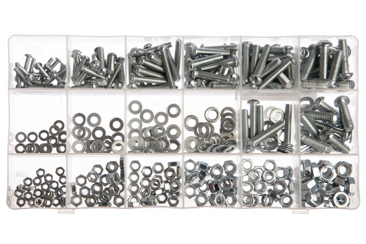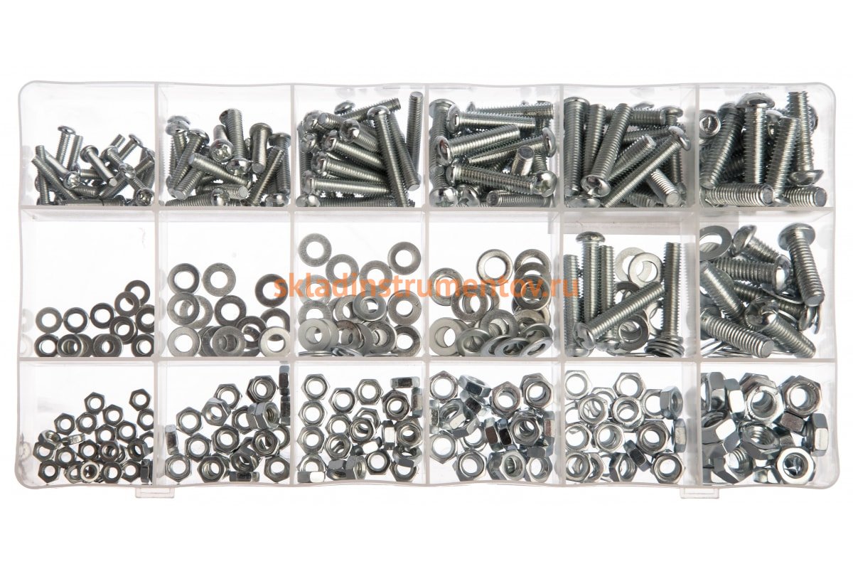 Набор винтов, гаек, шайб СИБРТЕХ 420 предметов 47617 подойдет для использования в быту. В комплект входят самые популярные размеры гаек, винтов и шайб, которые образуют между собой соединение для монтажа конструкций. Все предметы выполнены из стали. Комплект поставляется в удобном кейсе с отсеками.