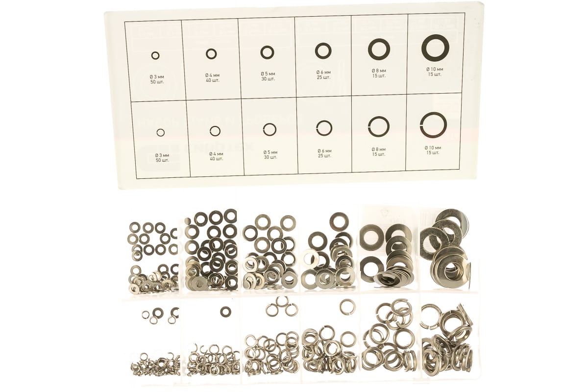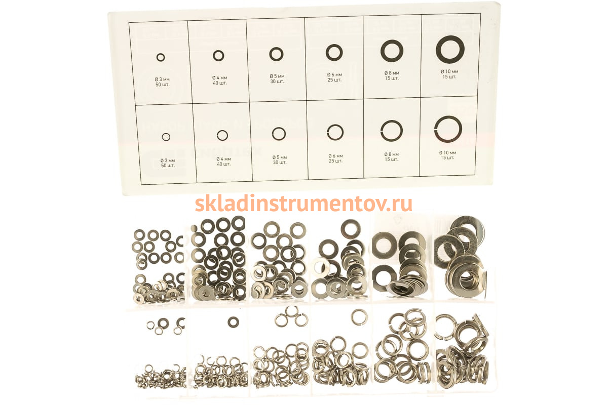 Набор шайб и гроверов СИБРТЕХ 350 предметов 47614 представляет собой комплект крепежа для фиксации болтов. Изделия набора изготовлены из прочной стали и включают все известные размеры. Пластиковый кейс обладает отсеками и обеспечивает компактность хранения.