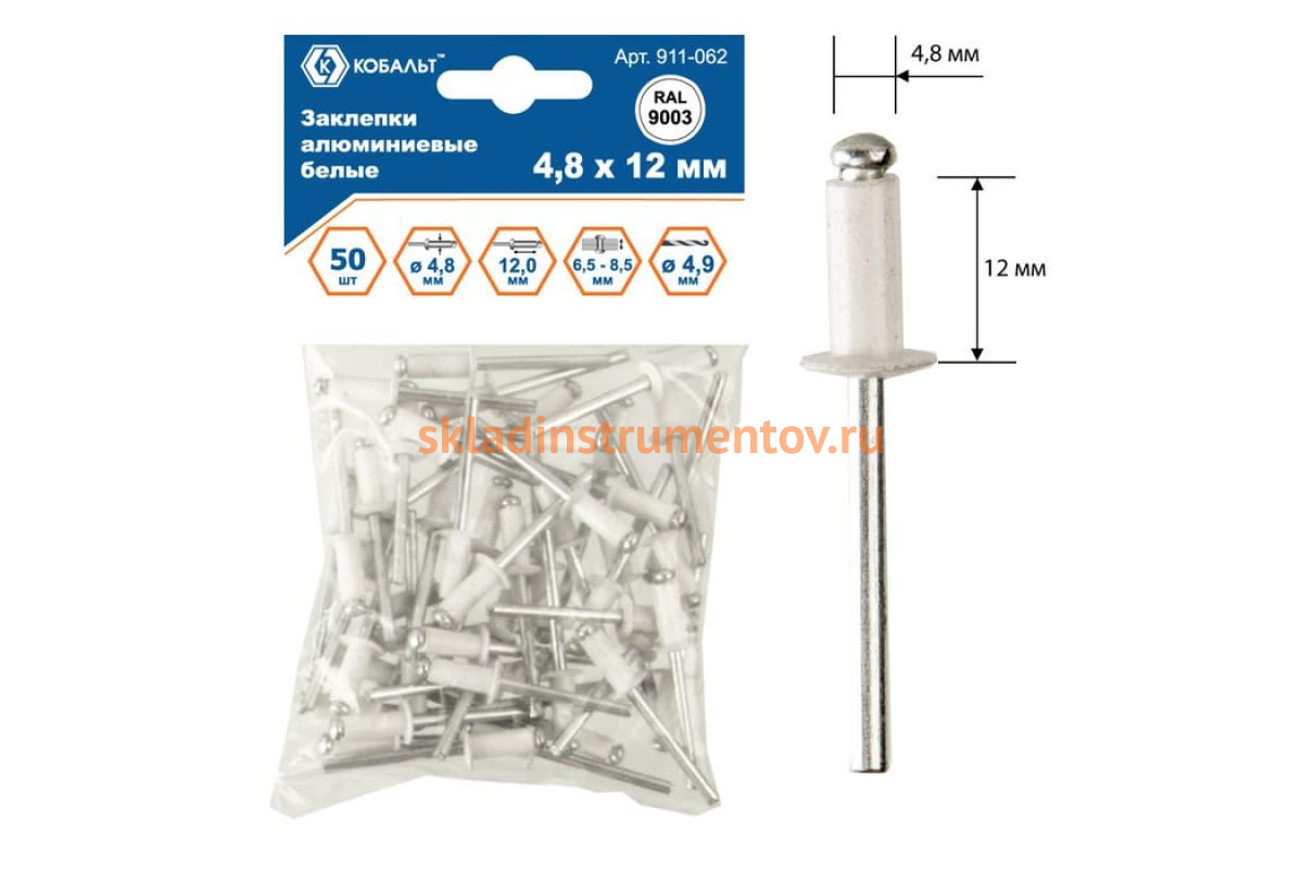 Заклепки вытяжные алюминиевые КОБАЛЬТ 911-062 применяются для скрепления между собой листовых материалов. Устанавливаются в отверстие, после чего расклепываются со стороны стержня, образуя прочное неразъемное соединение.