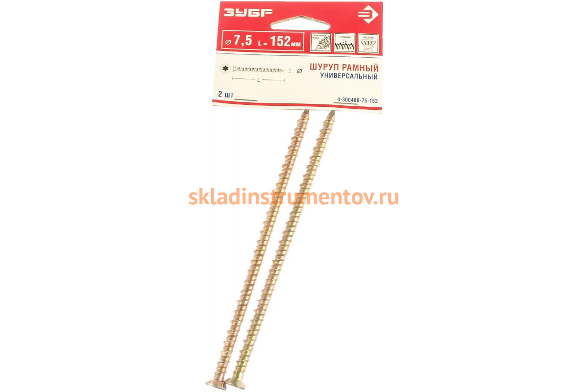 —Рамные универсальные шурупы с потайной головкой Зубр хроматированные, TORX 30, 7,5x152мм, ТФ6, 2 штуки 4-300486-75-152—