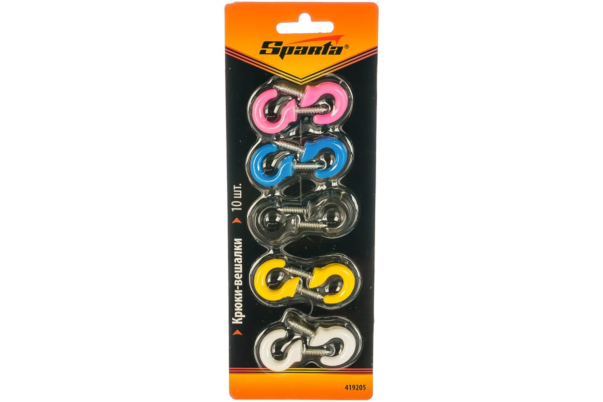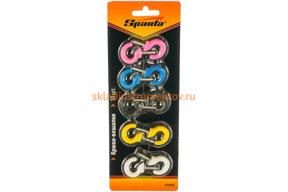Крюки-вешалки SPARTA 10 шт. 419205 представляют собой металлические саморезы с загнутыми серповидными пластмассовыми наконечниками.
