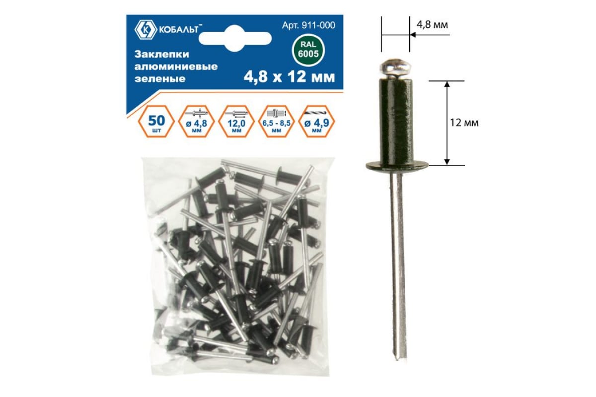 Заклепки вытяжные алюминиевые КОБАЛЬТ 911-000 применяются для скрепления между собой листовых материалов. Устанавливаются в отверстие, после чего расклепываются со стороны стержня, образуя прочное неразъемное соединение.
