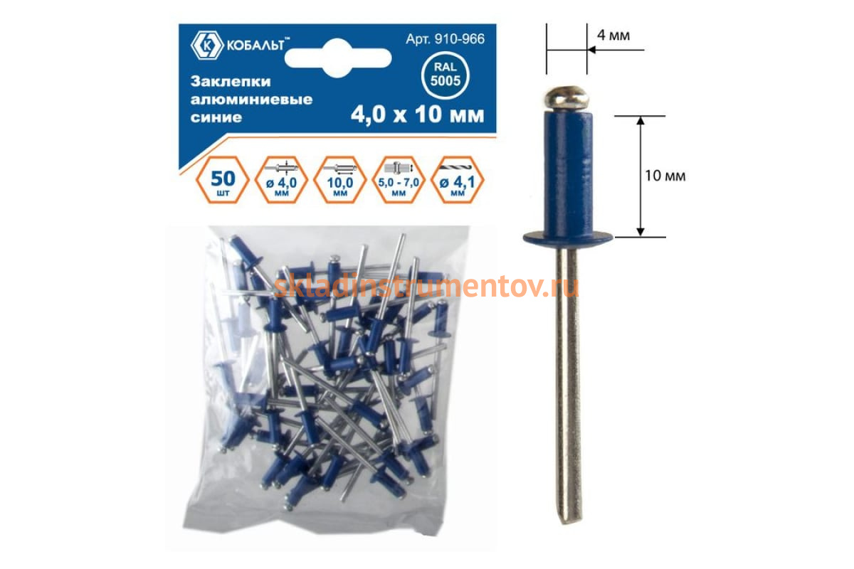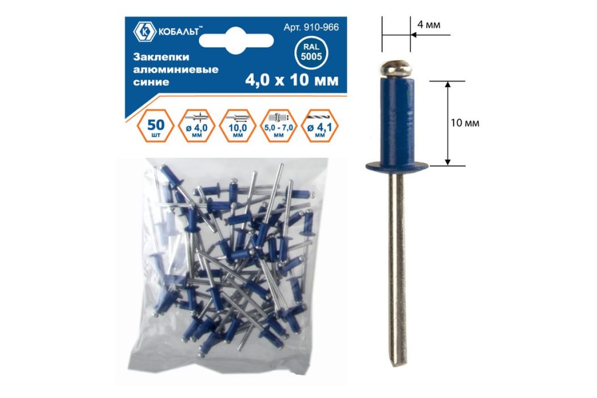 Заклепки вытяжные алюминиевые КОБАЛЬТ 910-966 применяются для скрепления между собой листовых материалов. Устанавливаются в отверстие, после чего расклепываются со стороны стержня, образуя прочное неразъемное соединение.