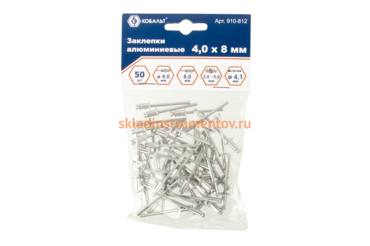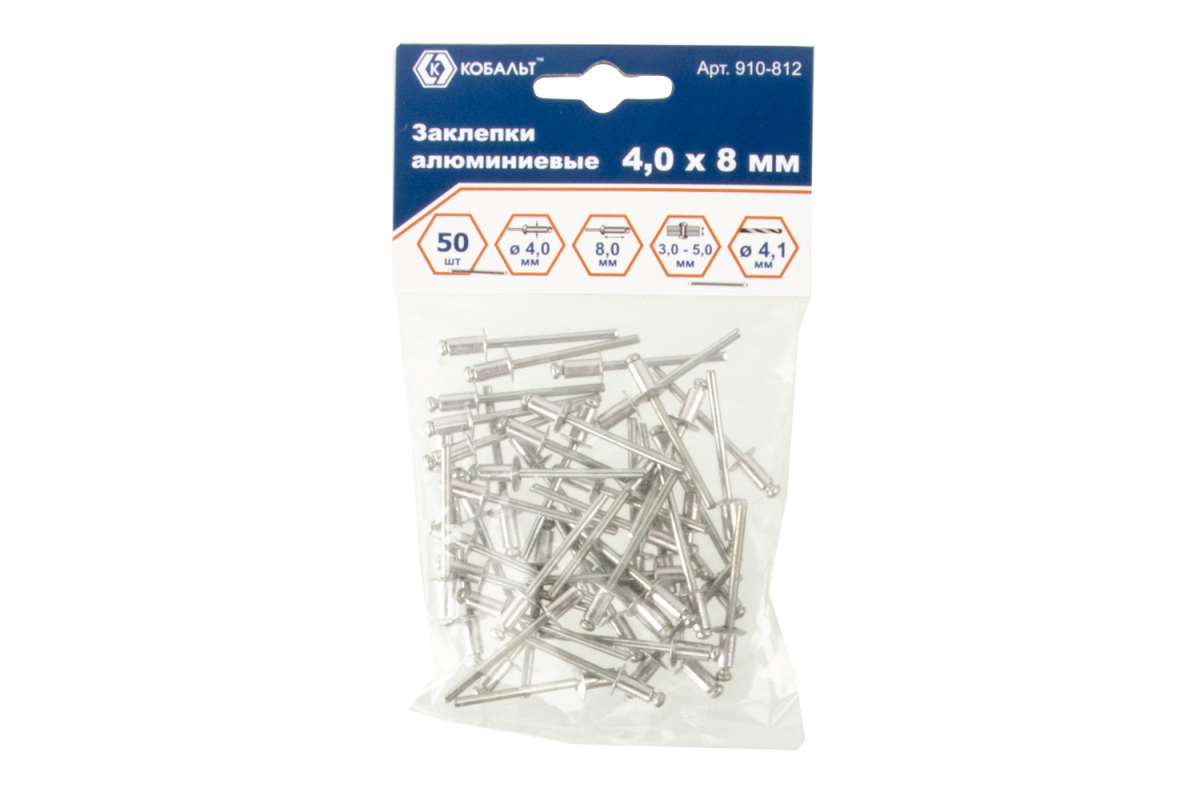 Заклепки вытяжные алюминиевые КОБАЛЬТ 910-812 применяются для скрепления между собой листовых материалов. Устанавливаются в отверстие, после чего расклепываются со стороны стержня, образуя прочное неразъемное соединение.