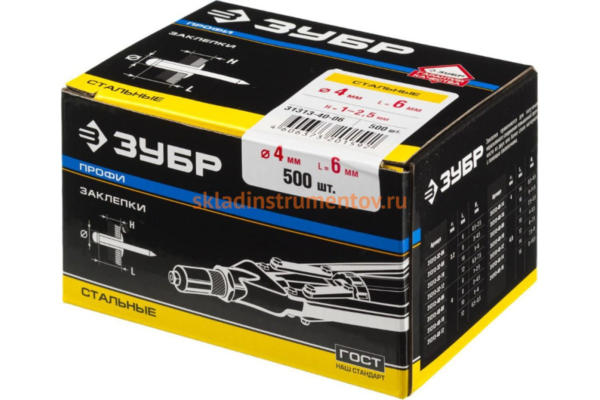 Заклепки стальные (4,0 мм x 6 мм) 500 шт. "ПРОФИ" Зубр 31313-40-06 применяются для скрепления между собой листовых материалов. Устанавливаются в отверстие, после чего расклепываются со стороны стержня, образуя герметичное прочное неразъемное соединение. Изготовлены из высококачественной оцинкованной стали.