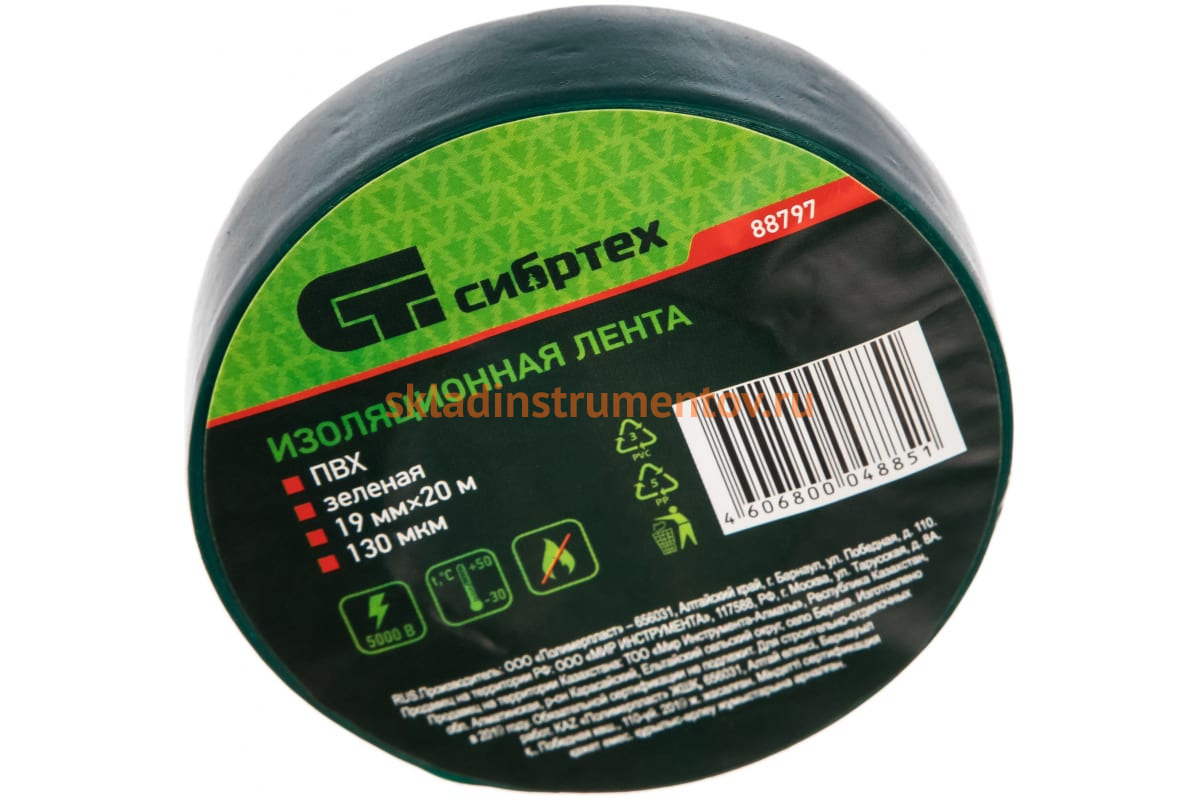Изолента ПВХ СИБРТЕХ 19ммх20м 180 мкм зеленая 88797 применяется для монтажа, крепежа, фиксации и упаковки. Изделие служит для изоляции и соединения электропроводов и мест их стяжек. Лента изготовлена из ПВХ с клеевой основой. Цвет - зеленый.
