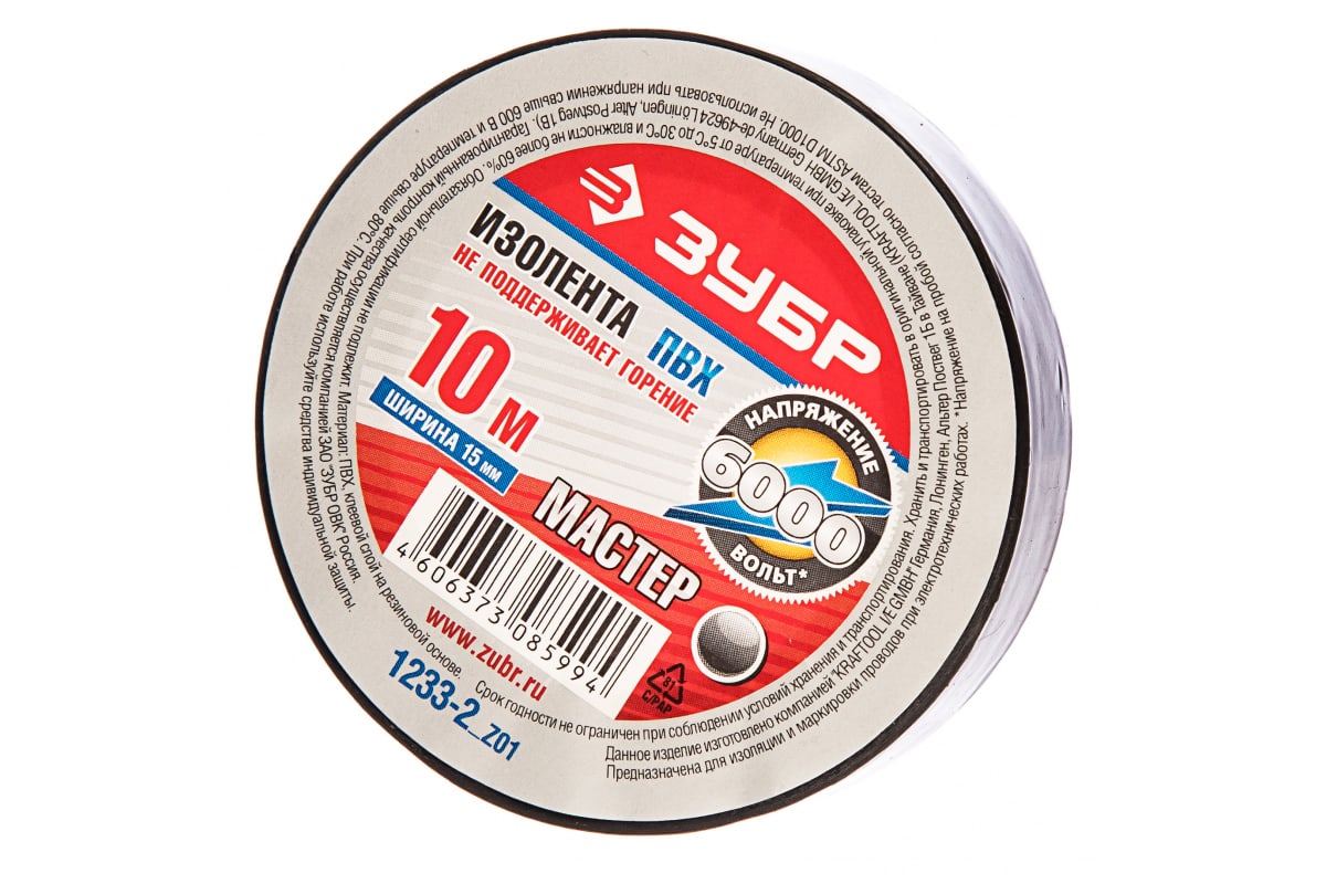 Черная изолента 6000 В, 15мм х 10м ЗУБР МАСТЕР 1233-2_z01 применяется для изоляции деталей и проводов, находящихся под напряжением до 6000 В. Материалом ленты является ПВХ. Изделие имеет достаточно большую длину - 10 метров. В ширину изделие составляет 15 мм.