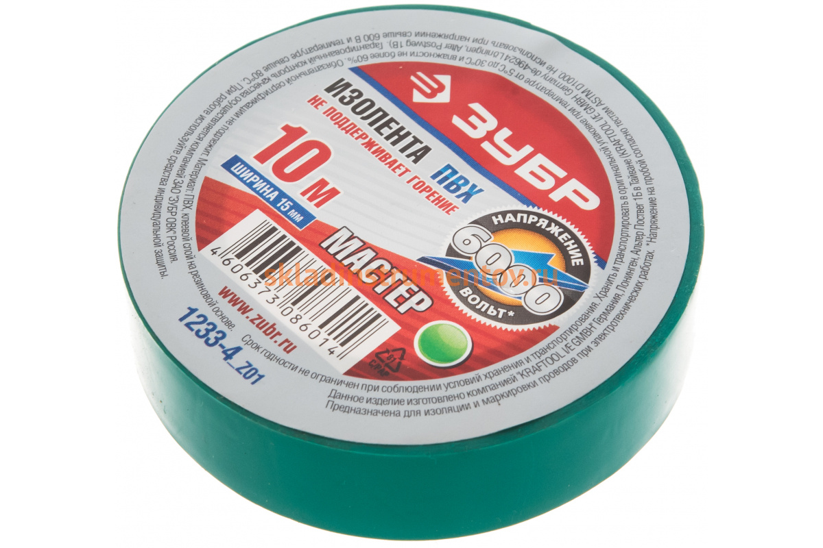 Изолента "МАСТЕР" зеленая ЗУБР 1233-4_z01 применяется для электроизоляции оголенных проводов (до 6 кВ) и при проведении различных ремонтных работ. Выполнена из полихлорвинила (ПВХ), имеет гладкую поверхность и хорошую клейкость. Не поддерживает горение. Длина - 10 м.