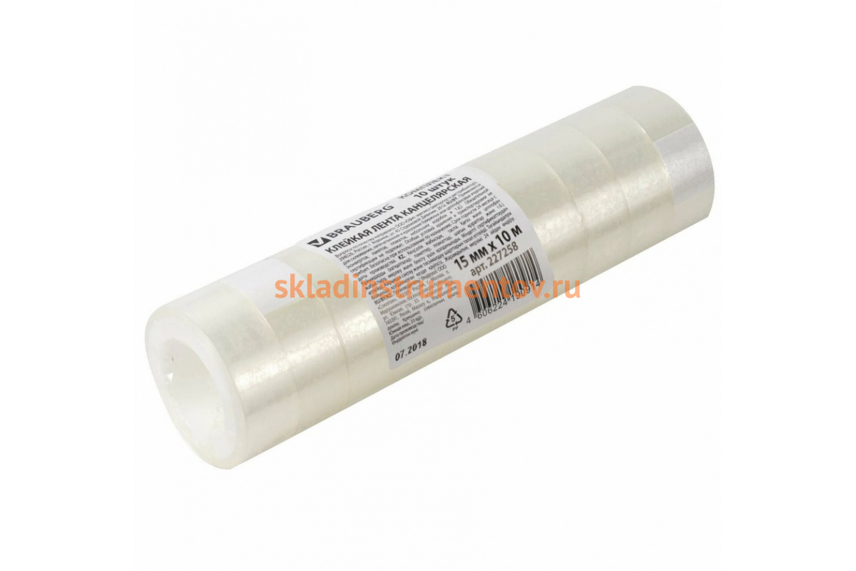 —Канцелярская клейкая лента BRAUBERG 15 мм х 10 м, 10 шт., прозрачная 227258