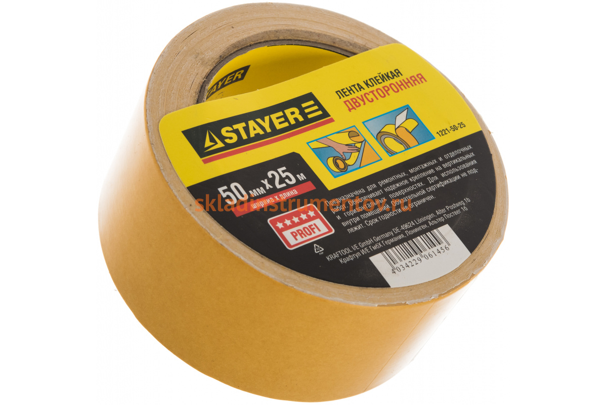 Клеящая двухсторонняя лента 1221-50-25 Stayer применяется в производственных и бытовых условиях. Главной особенностью ленты является тканевое волокно, на которое с обеих сторон нанесен клей из каучука. Обеспечивает надежное крепление и широко используется для любых элементов из бумаги, картона, резины, пластика и т.д. Гораздо более функциональна, чем лента с одной клеящей стороной. Сохраняет свои свойства при температуре до +60°С.
