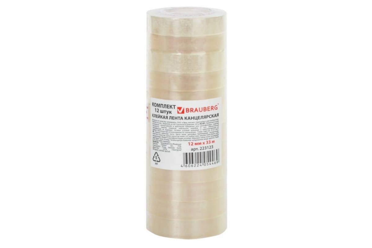 —Клейкие ленты BRAUBERG 12 мм х 33 м, канцелярские, комплект 12 шт., прозр., гарант. длина 223123