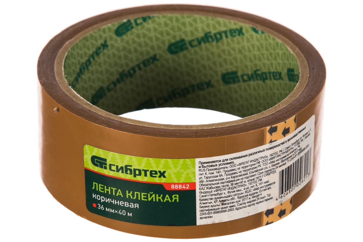 Клейкая лента СИБРТЕХ 36ммх40м цвет коричневый 88842 выполнен из полиэтиленовой ленты, на которую нанесен клеевой слой с высокой адгезией. Изделие используется в хозяйстве и быту для фиксации, крепления, монтажа и т.п. Цвет - коричневый.