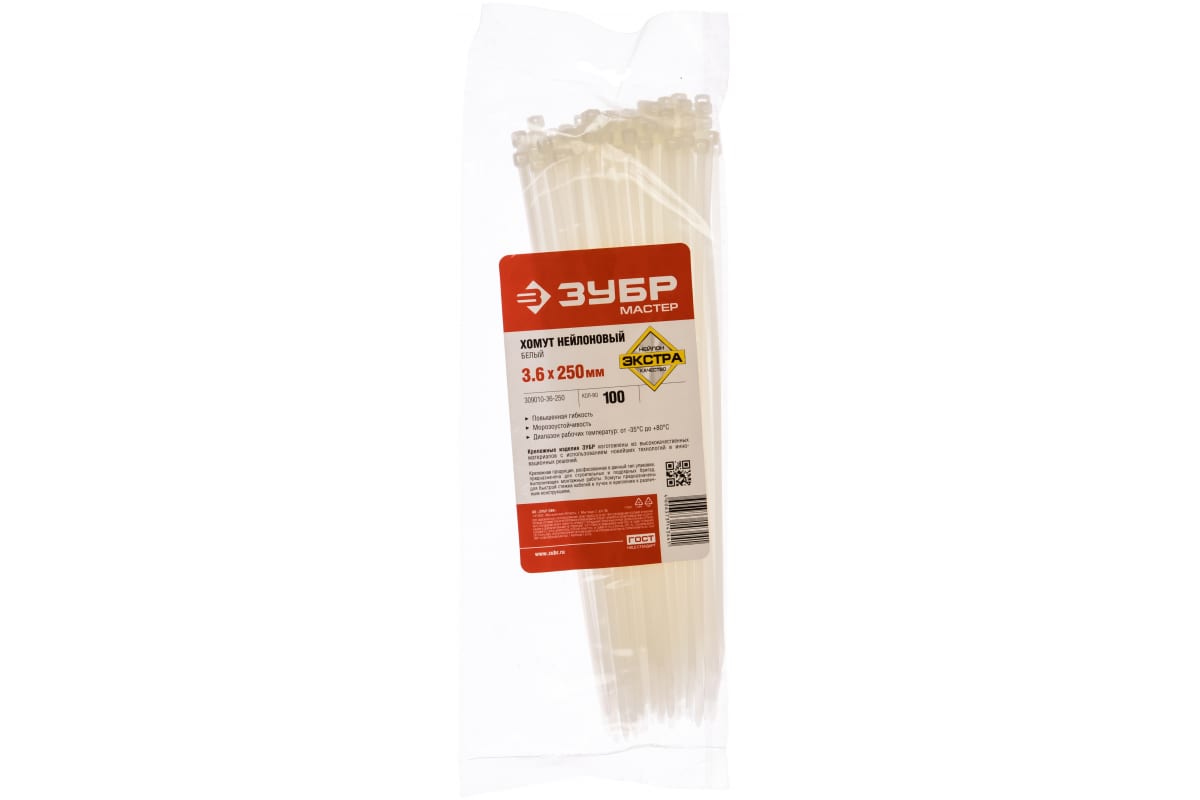 —Нейлоновые хомуты Зубр белые, 3.6x250 мм, 100 шт. 309010-36-250—
