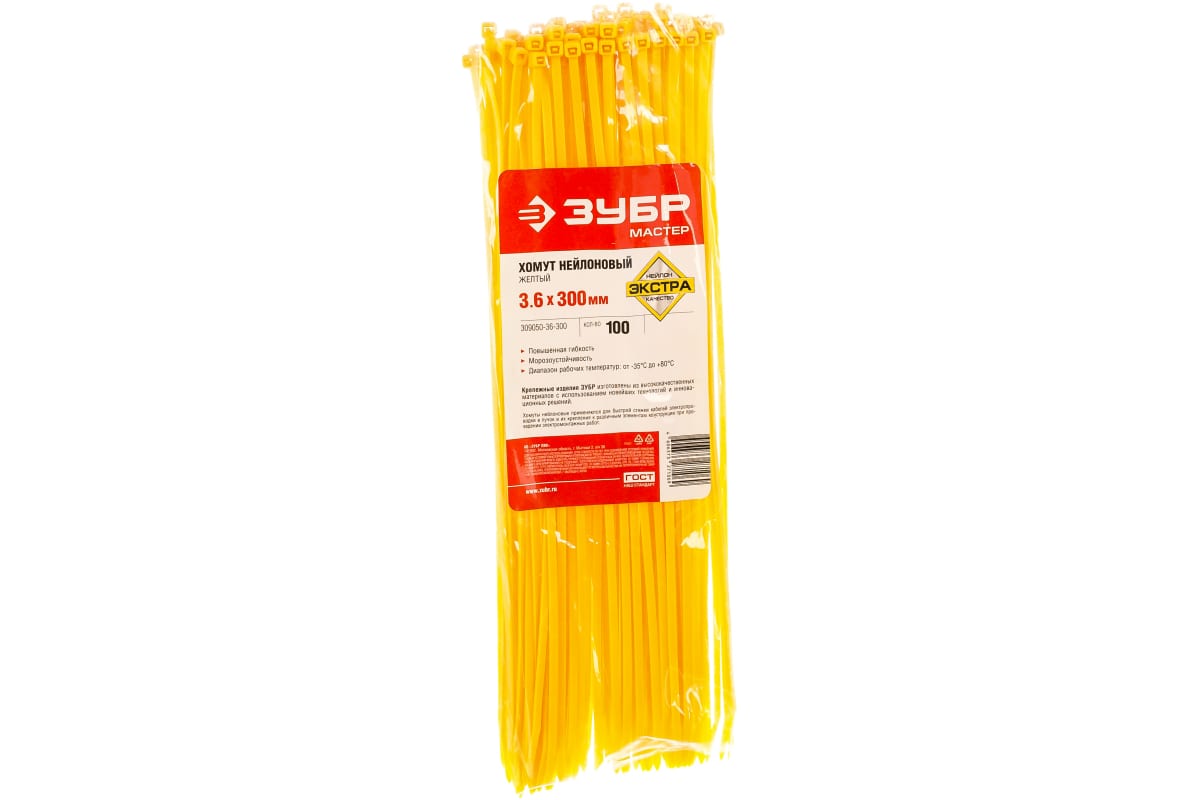 —Нейлоновый хомут Зубр МАСТЕР желтый, 3,6 мм x 300 мм, 100 шт 309050-36-300—