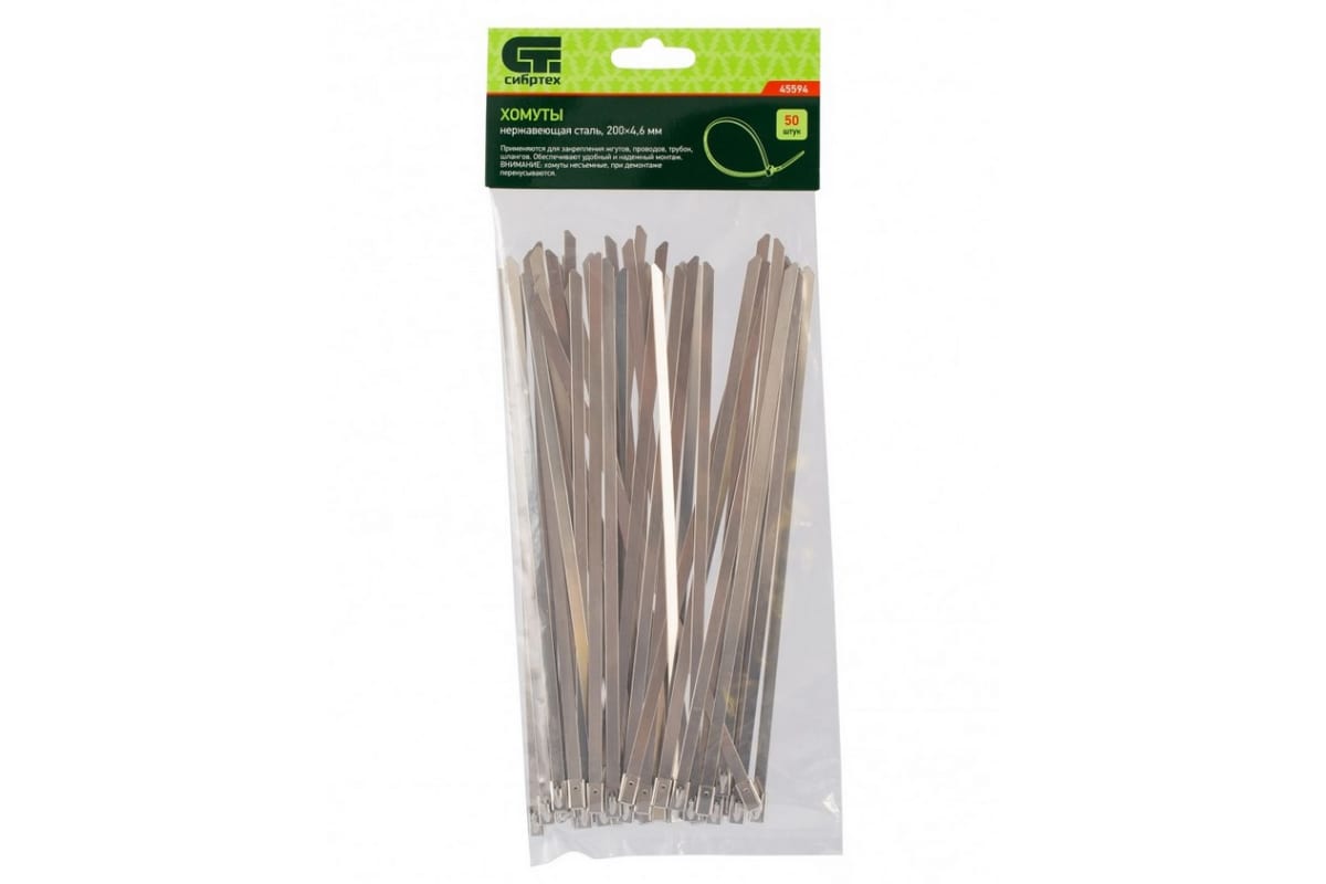 —Хомуты СИБРТЕХ, 200 х 4,6 мм, нержавеющая сталь, 50 шт 45594—