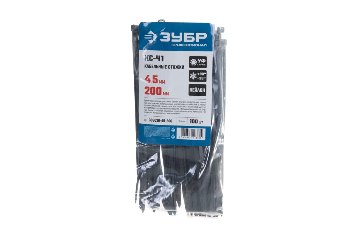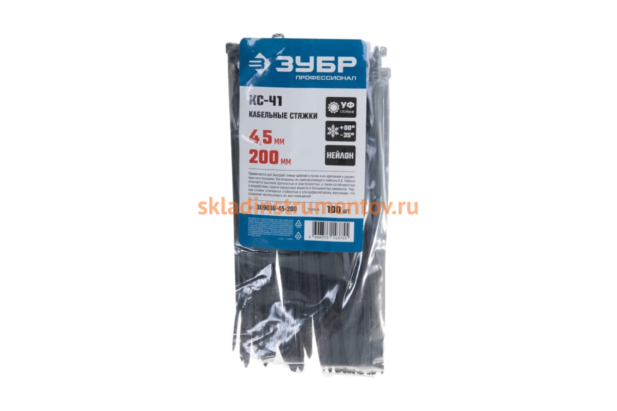 —Нейлоновые хомуты Зубр черные, 4.5x200 мм, 100 шт. 309030-45-200—