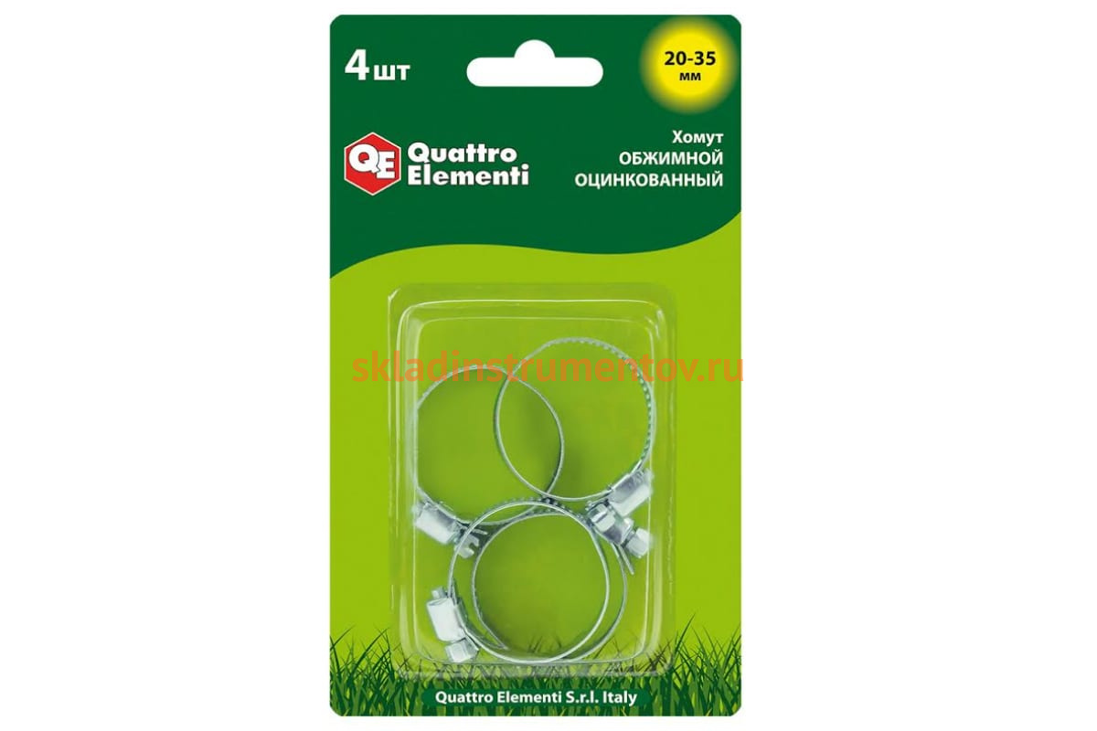Обжимной хомут QUATTRO ELEMENTI 20-35 мм оцинкованный, 4 шт 642-203 изготовлен из стали и покрыт цинком для защиты от коррозии. Комплект из 4 хомутов поставляется в блистере. Изделия применяются для обжима и фиксации труб, шлангов, кабелей и т.п.