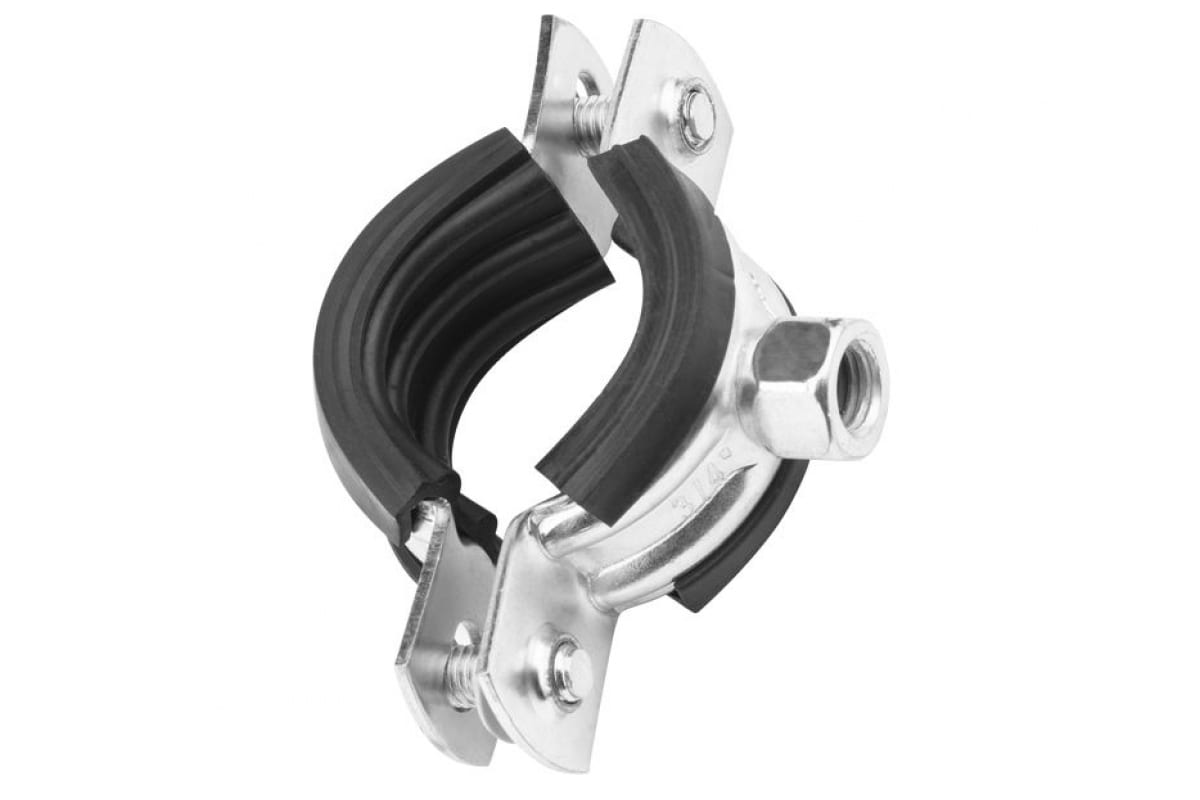 Трубный оцинкованный хомут Зубр с гайкой, 3/4 37850-25-29-1 изготовлен из стали, оснащен уплотнителями из резины и двумя ребрами жесткости. Изделие предназначено для крепления труб различного назначения диаметром от 25 до 29 мм. Хомут имеет оцинкованное покрытие и обладает гайкой для прочного закручивания. Резьба М8.