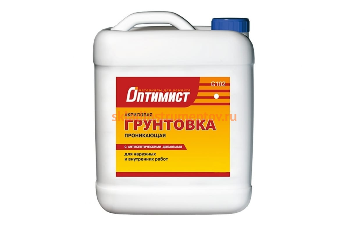 Проникающая грунтовка Оптимист G102 акриловая, для наружных и внутренних работ, 10 л OPG005 предназначена для подготовки основания к последующей отделке (покраска, наклеивание обоев, укладка плитки, шпатлевание). Возможно использование при укладке напольных самовыравнивающихся смесей.