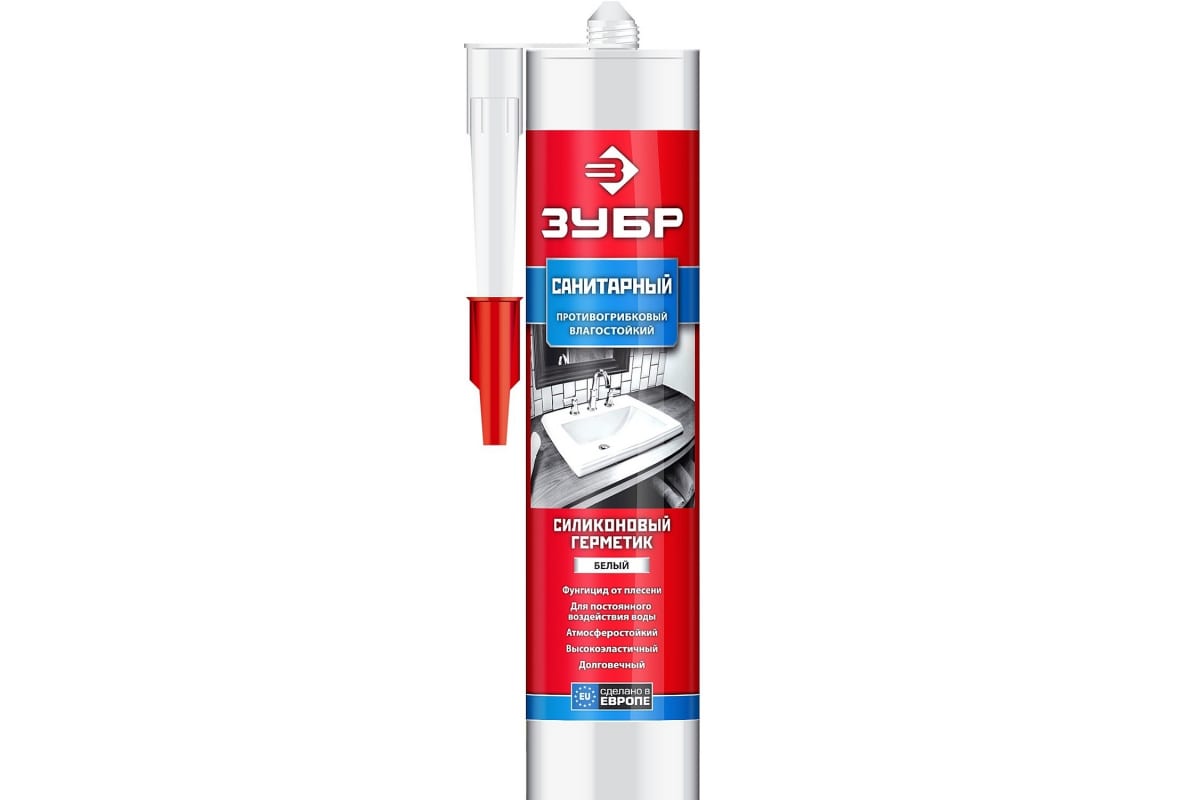 Силиконовый герметик ЗУБР 280 мл, санитарный, белый 41235-0 используется как для наружных, так и внутренних работ. Его основной является силикон. Он обладает хорошей адгезией к большинству строительных материалов, например, стеклу, керамике, металлу, пластику, ПВХ, древесине, резине, а также устойчив к длительному воздействию воды. Применяют при строительстве и в быту для заполнения и герметизации швов, щелей, стыков. Нельзя использовать с материалами, подвергающимися коррозии и в местах возможного контакта с пищей.