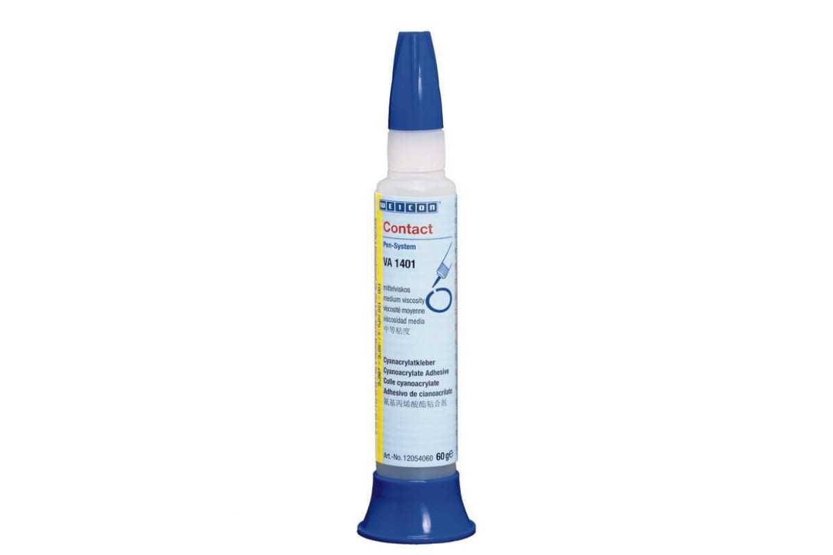 Цианоакрилатный клей WEICON Contact VA 1401 60 г (основа - этилат) wcn12054060 быстро полимеризуется засчет влажности, находящейся на склеиваемой поверхности и воздействию воздуха.