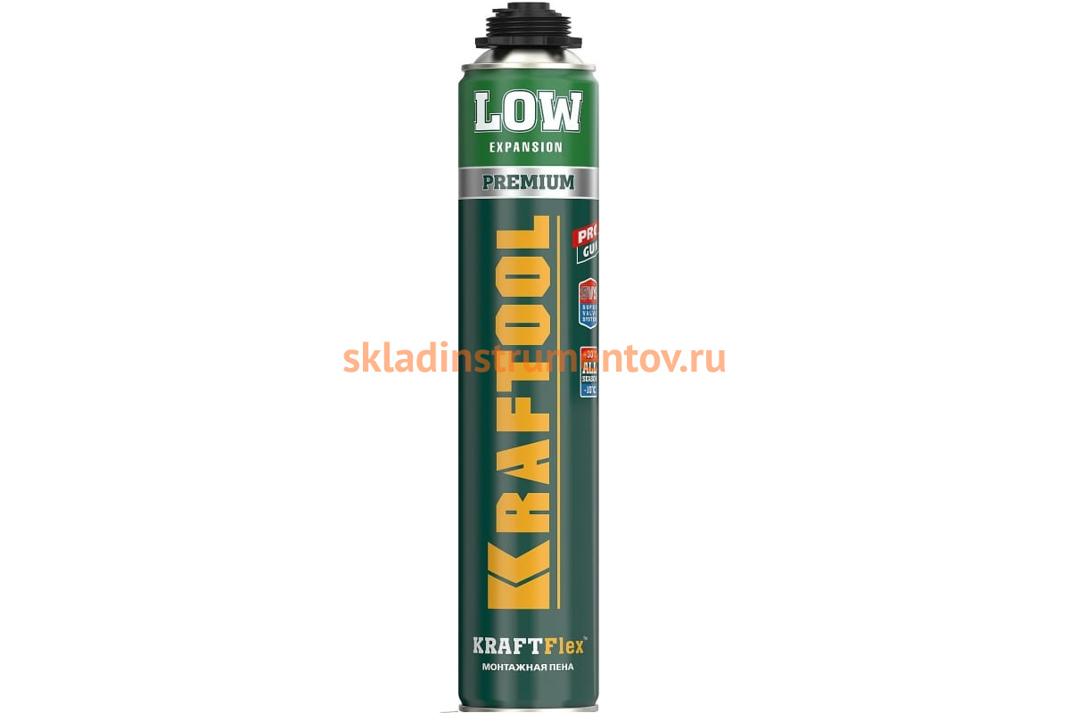 Профессиональная полиуретановая пена для монтажного пистолета Kraftool KRAFTFLEX PROFI LOW всесезонная, SVS, 750 мл 41181_z01 применяется для монтажа и герметизации оконных и дверных блоков, подоконников, а также для изоляции проводки и технических коммуникаций, тепло- и звукоизоляции, заполнения швов, щелей, пустот. Баллон оснащен суперклапаном SVS, поэтому хранить его можно как в вертикальном, так и горизонтальном положении.