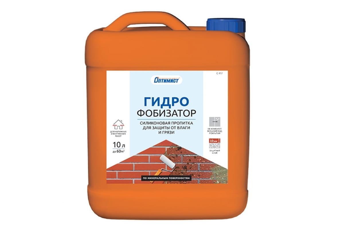 Гидрофобизатор Оптимист С417 10 л 00-00001558 предназначен для обработки минеральных оснований с целью предотвращения проникновения влаги и загрязнения. Обрабатываемая поверхность приобретает стойкость к атмосферным воздействиям. Гидрофобизатор практически не имеет запаха, нетоксичен. Возможно нанесение при помощи кисти, валика или распылителя. Применение пропитки продлевает срок службы минеральных поверхностей.