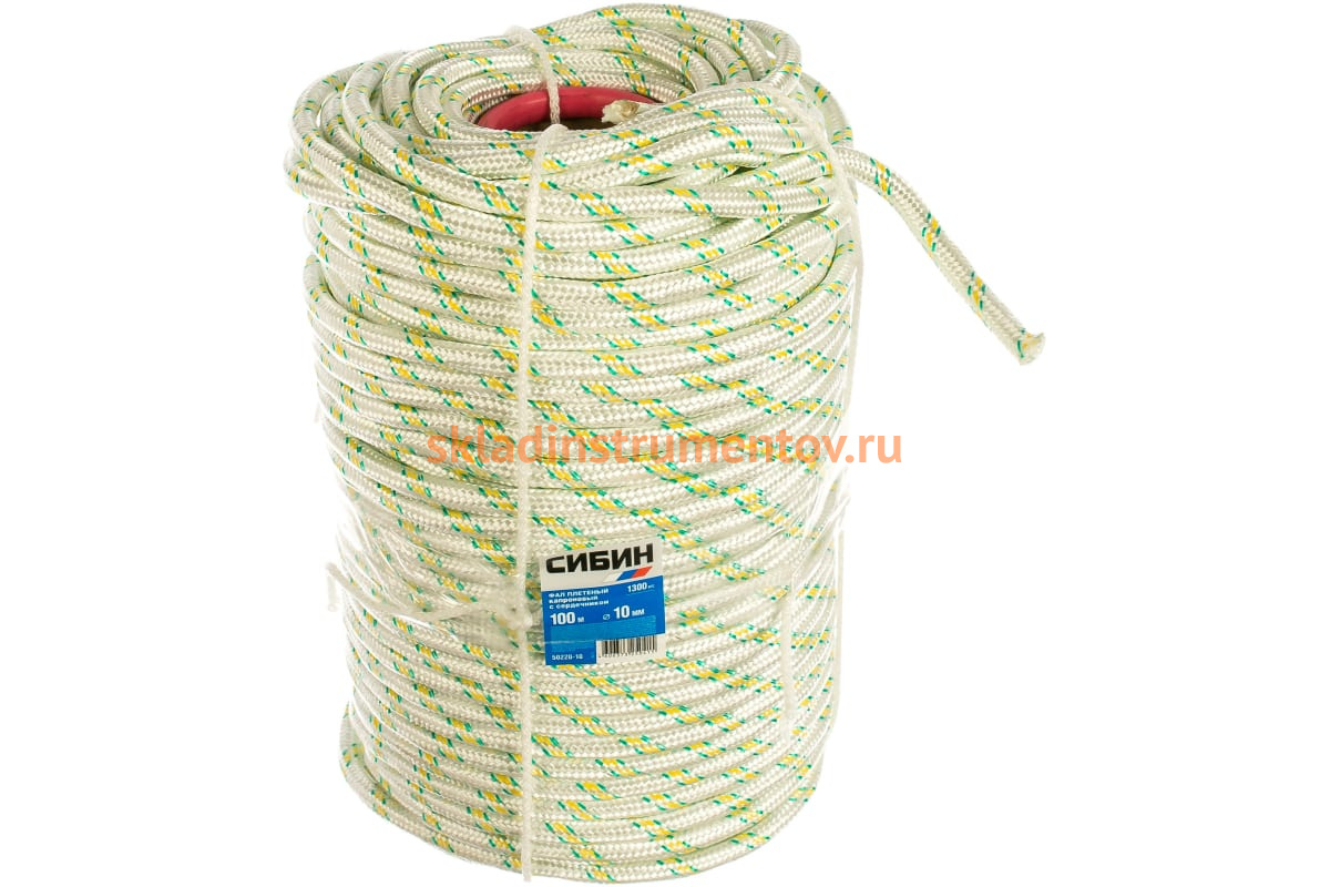 Плетёный капроновый 24-прядный фал с капроновым сердечником, диаметр 10мм, бухта 100м, 1300кгс СИБИН 50220-10 - хозяйственно-бытовое изделие для обвязочных и упаковочных работ, а также операций с грузами. Фал не тонет в воде, не усаживается и не утрачивает прочностные характеристики при намокании. Изделие не подвержено гниению, устойчиво к различным климатическим средам, а также воздействию химикатов и ультрафиолета.