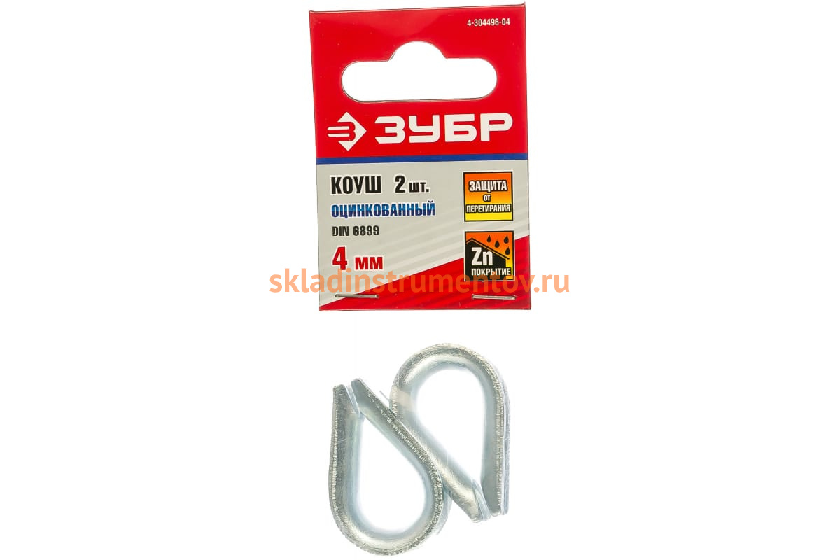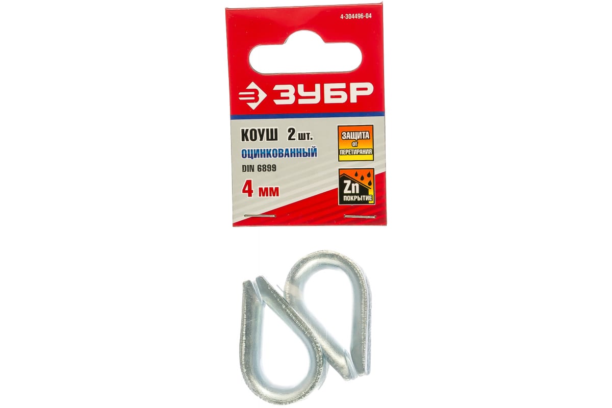 Коуш Зубр 4-304496-04 изготовлен по DIN 6899 из углеродистой стали. Далее он проходит процесс оцинковки, что делает его устойчивым к коррозии. Коуш необходим для получения петель на концах троса. При его применении петля получается более плавной. Так же коуш предохраняет трос от перетирания.