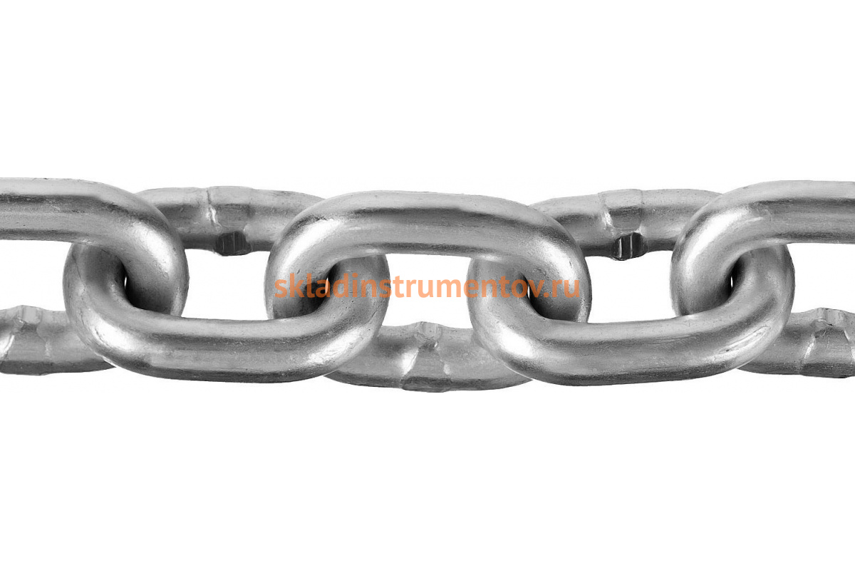 Цепь короткозвенная DIN 766 Зубр 4-304050-08 предназначена для перемещения грузов и их подъема на нужную высоту с помощью различных грузоподъемных устройств. Она изготовлена из оцинкованной углеродистой стали с помощью сварки. Цепь можно легко укорачивать до нужного размера путем образования петли, вставляя звено в звено. Не предназначена для ударных нагрузок.