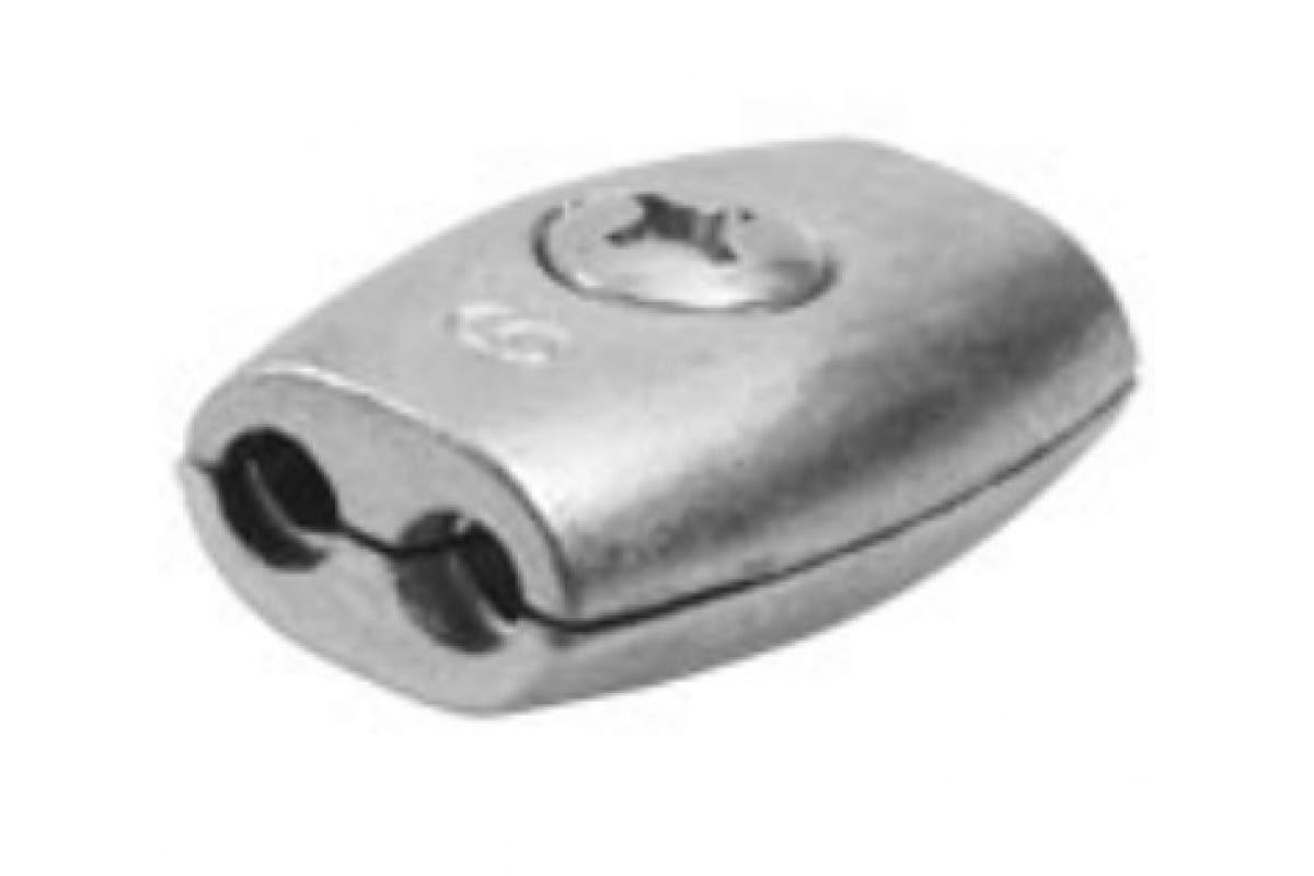 Зажим "Бочонок" Зубр 4-304455-02 изготовлен из цинкового сплава и оцинкованной стали. С его помощью изготавливают петли на концах троса. Для этого свободный конец троса помещается внутрь зажима (конец троса должен выходить из зажима на расстояние не менее чем 1/2 диаметра троса). В полученную петлю закладывают коуш, после которого трос помещается в зажим с другой стороны отверстия. Сверху размещается прижимная крышка, и соединение крепко закручивается с помощью винта.